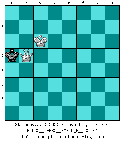 Last move : 1-0 2013 April 15 20:55:42 [Event "FICGS__CHESS__RAPID_E__000101"] [Site "FICGS"] [Date "2013.04.07"] [Round "1"] [White "Stoyanov,Zdravko"] [Black "Cavaille,Cedric"] [Result "1-0"] [WhiteElo "1282"] [BlackElo "1022"] 1.e4 e5 2.Nf3 Nc6 3.h3 Nf6 4.d3 Bb4+ 5.c3 Be7 6.Be2 d5 7.exd5 Nxd5 8.c4 Nf6 9.O-O O-O 10.Re1 Nd4 11.Nxe5 Nxe2+ 12.Qxe2 Bd6 13.Nf3 Re8 14.Qd1 Rxe1+ 15.Qxe1 Qe8 16.Bd2 Qxe1+ 17.Bxe1 c5 18.Nc3 a6 19.Ne4 Be7 20.Bc3 Bf5 21.Nxf6+ Bxf6 22.Bxf6 gxf6 23.Rd1 Rd8 24.d4 cxd4 25.Rxd4 Rxd4 26.Nxd4 Be6 27.b3 Kg7 28.Nxe6+ fxe6 29.f4 f5 30.Kf2 Kg6 31.Kf3 h5 32.g3 Kf6 33.g4 hxg4+ 34.hxg4 fxg4+ 35.Kxg4 e5 36.f5 e4 37.Kf4 e3 38.Kxe3 Kxf5 39.Kd4 Ke6 40.Kc5 Kd7 41.Kb6 Kc8 42.a3 Kb8 43.b4 Ka8 44.c5 Kb8 45.a4 Ka8 46.b5 axb5 47.axb5 Kb8 48.c6 bxc6 49.bxc6 Ka8 50.Kc5 Kb8 51.Kd6 Kc8 52.Kc5 Kc7 53.Kd5 Kd8 54.Kd6 Kc8 55.c7 Kb7 56.Kd7 Ka7 57.c8Q Kb6 58.Qc6+ Ka5 59.Qc1 Kb4 60.Kd6 Kb3 61.Kd5 Kb4 62.Qc2 Kb5 63.Qb3+ Ka6 64.Kc6 Ka5 65.Qb5+ 1-0 King's pawn game Kingside Castling by player White (move 9) Kingside Castling by player Black (move 9) 10 pieces endgame at move 34 : White KPPPP , Black KPPPP WHITE : King + 4 Pawns BLACK : King + 4 Pawns 9 pieces endgame at move 35 : White KPPPP , Black KPPP WHITE : King + 4 Pawns BLACK : King + 3 Pawns 8 pieces endgame at move 38 : White KPPPP , Black KPP WHITE : King + 4 Pawns BLACK : King + 2 Pawns 7 pieces endgame at move 38 : White KPPP , Black KPP WHITE : King + 3 Pawns BLACK : King + 2 Pawns 6 pieces endgame at move 46 : White KPP , Black KPP WHITE : King + 2 Pawns BLACK : King + 2 Pawns 5 pieces endgame at move 47 : White KPP , Black KP WHITE : King + 2 Pawns BLACK : King + 1 Pawn 4 pieces endgame at move 48 : White KP , Black KP WHITE : King + 1 Pawn BLACK : King + 1 Pawn 3 pieces endgame at move 49 : White KP , Black K WHITE : King + 1 Pawn BLACK : King + Promotion Queen by player White (move 57) Player White won this chess game. Follow this game move after move (download)Do you realize Fischer almost never has any bad pieces? He exchanges them, and the bad pieces remain with his opponents. (Yuri Balashov) Wenn Spassky eine Figur opfert kannst du genauso gut aufgeben. Aber wenn Tal eine Figur opfert, spiel weiter. Er könnte noch eine weitere opfern, und dann ... wer weiß? (Miguel Najdorf) Todavía soy una víctima del Ajedrez. Tiene toda la belleza del arte y mucho mas. No puede ser comercializado. El Ajedrez es mas puro que el arte en su posición social. (Marcel Duchamp) On n'a jamais que l'âge auquel on a commence à jouer aux échecs car après on cesse de vieillir. (Capablanca) I find television to be very educating. Every time somebody turns on the set, I go in the other room and read a book. (Groucho Marx)