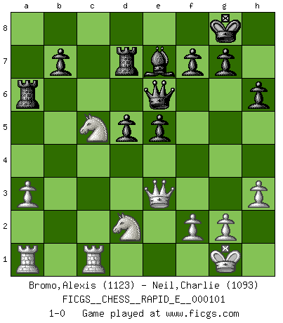 Last move : 1-0 2013 April 26 0:1:57 [Event "FICGS__CHESS__RAPID_E__000101"] [Site "FICGS"] [Date "2013.04.07"] [Round "1"] [White "Bromo,Alexis"] [Black "Neil,Charlie"] [Result "1-0"] [WhiteElo "1123"] [BlackElo "1093"] 1.d4 Nf6 2.c4 c5 3.Nc3 cxd4 4.Qxd4 Nc6 5.Qd1 e5 6.e4 d6 7.Bd3 Be7 8.Nf3 h6 9.Be3 Bd7 10.h3 O-O 11.a3 a6 12.O-O Qc8 13.b4 Be6 14.b5 axb5 15.Nxb5 Rd8 16.Bb6 Rd7 17.Qd2 Na5 18.Bxa5 Ra6 19.Rfb1 Bxc4 20.Bxc4 Qxc4 21.Bc3 Nxe4 22.Qe3 Nxc3 23.Nxc3 Bf6 24.Ne4 Be7 25.Rc1 Qe6 26.Nfd2 d5 27.Nc5 1-0 Benoni defense Kingside Castling by player Black (move 10) Kingside Castling by player White (move 12) Player White won this chess game. Follow this game move after move (download)It is the aim of the modern school, not to treat every position according to one general law, but according to the principle inherent in the position. (Richard Reti) Sicherlich können nur Meister einen Stil haben. Daß ein nicht-Meister auch nur ein einziges Mal in seinem Leben eine Partie folgerecht durchführte, habe ich niemals bemerkt. (Emanuel Lasker) El Rey es una pieza de pelea. ¡Usenlo!. (Wilhelm Steinitz) Il (Jacob Murray) ne joue pas pour le bon coup, mais pour le meilleur. (Eloi Relange) To be champion requires more than simply being a strong player; one has to be a strong human being as well. (Anatoly Karpov)