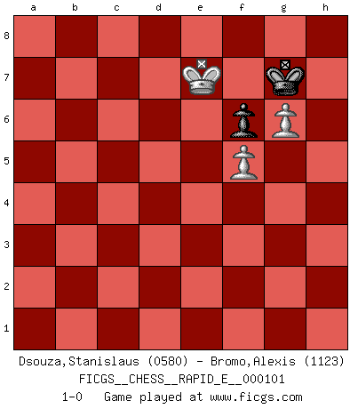 Last move : 1-0 2013 May 7 21:31:48 [Event "FICGS__CHESS__RAPID_E__000101"] [Site "FICGS"] [Date "2013.04.07"] [Round "1"] [White "Dsouza,Stanislaus"] [Black "Bromo,Alexis"] [Result "1-0"] [WhiteElo "0580"] [BlackElo "1123"] 1.e4 e5 2.Nf3 Nc6 3.d3 h6 4.Nc3 Nf6 5.Be2 Bb4 6.Bd2 Bxc3 7.Bxc3 d6 8.O-O Bg4 9.Nd2 b6 10.Bxg4 Nxg4 11.Qxg4 Qg5 12.Qxg5 hxg5 13.Nf3 g4 14.Nd2 b5 15.a3 a5 16.b3 O-O-O 17.f3 g3 18.hxg3 Rh7 19.Kf2 Kd7 20.Rh1 Rxh1 21.Rxh1 Ke6 22.f4 b4 23.axb4 axb4 24.f5+ Kd7 25.Rh7 bxc3 26.Nf3 Nd4 27.Nxd4 exd4 28.Rxg7 Ke7 29.Kf3 Ra8 30.g4 Ra2 31.g5 Rxc2 32.Rh7 Rb2 33.Rh1 c2 34.Rc1 c5 35.g3 Rxb3 36.Ke2 f6 37.g6 Kf8 38.Kd2 c4 39.dxc4 Rxg3 40.Rxc2 Re3 41.c5 Rxe4 42.cxd6 Ke8 43.Rc7 Re5 44.Re7+ Rxe7 45.dxe7 Kxe7 46.Kd3 Kf8 47.Kxd4 Kg7 48.Kd5 Kf8 49.Ke6 Kg7 50.Ke7 1-0 King's pawn game Kingside Castling by player White (move 8) Queenside Castling by player Black (move 16) 10 pieces endgame at move 41 : White KRPPP , Black KRPPP WHITE : King + 1 Rook 3 Pawns BLACK : King + 1 Rook 3 Pawns 9 pieces endgame at move 42 : White KRPPP , Black KRPP WHITE : King + 1 Rook 3 Pawns BLACK : King + 1 Rook 2 Pawns 8 pieces endgame at move 44 : White KPPP , Black KRPP WHITE : King + 3 Pawns BLACK : King + 1 Rook 2 Pawns 7 pieces endgame at move 45 : White KPPP , Black KPP WHITE : King + 3 Pawns BLACK : King + 2 Pawns 6 pieces endgame at move 45 : White KPP , Black KPP WHITE : King + 2 Pawns BLACK : King + 2 Pawns 5 pieces endgame at move 47 : White KPP , Black KP WHITE : King + 2 Pawns BLACK : King + 1 Pawn Player White won this chess game. Follow this game move after move (download)The older I grow, the more I value pawns. (Paul Keres) Die starken Figuren des Gegners muss man abtauschen. (José Raúl Capablanca) El Ajedrez lo es todo: arte, ciencia y deporte. (Anatoly Karpov) Si rien de grave n'est détecté lors de l'analyse d'une position, on joue alors le coup. Seconde règle de Blumenfeld. A good programmer is someone who always looks both ways before crossing a one-way street. (Doug Linder)
