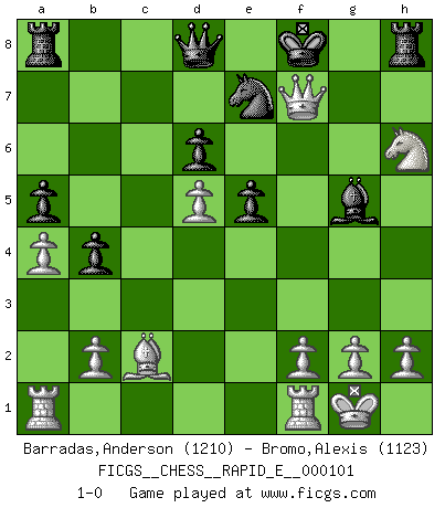 Last move : 1-0 2013 April 10 20:38:58 [Event "FICGS__CHESS__RAPID_E__000101"] [Site "FICGS"] [Date "2013.04.07"] [Round "1"] [White "Barradas,Anderson"] [Black "Bromo,Alexis"] [Result "1-0"] [WhiteElo "1210"] [BlackElo "1123"] 1.e4 e5 2.Nf3 Nc6 3.d4 d6 4.Bb5 a6 5.Ba4 Bd7 6.d5 Na7 7.Nc3 b5 8.Bb3 a5 9.a4 b4 10.Ne2 h6 11.c3 c5 12.cxb4 cxb4 13.O-O Nf6 14.Bc2 Bg4 15.Nh4 Be7 16.Qd3 Bxe2 17.Qxe2 Nxe4 18.Nf5 Ng5 19.Nxg7+ Kf8 20.Nf5 Nc8 21.Qh5 Bf6 22.Nxh6 Ne7 23.Bxg5 Bxg5 24.Qxf7+ 1-0 Scotch Opening Kingside Castling by player White (move 13) Player White won this chess game. Follow this game move after move (download)I have never in my life played the French Defence, which is the dullest of all openings. (Wilhelm Steinitz) Gott hat gewollt, dass ich Champion werde. (Surab Azmajparaschvili) Durante una competencia de Ajedrez, un Maestro de Ajedrez deberá ser una combinación de presa de caza y un Monge. (Alexander Alekhine) Nous sommes les pions de la mystérieuse partie d'Echecs jouée par Dieu. Il nous déplace, nous arrête, nous pousse encore, puis nous lance un à un dans la boîte du Néant. Epitaphe sur la tombe de David Janowsky (1868-1927). Without deviation from the norm, progress is not possible. (Frank Zappa)