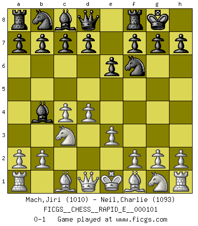 Last move : 0-1 2013 May 24 11:17:22 [Event "FICGS__CHESS__RAPID_E__000101"] [Site "FICGS"] [Date "2013.04.07"] [Round "1"] [White "Mach,Jiri"] [Black "Neil,Charlie"] [Result "0-1"] [WhiteElo "1010"] [BlackElo "1093"] 1.d4 Nf6 2.c4 e6 3.Nc3 Bb4 4.e3 O-O 0-1 This chess game has been lost on time (started : 2013.04.07 16:0:5) Nimzo-Indian : 4.e3 O-O Kingside Castling by player Black (move 4) Player Black won this chess game. Follow this game move after move (download)In Chess, as it is played by masters, chance is practically eliminated. (Emanuel Lasker) Mein Gehirn das ist mein zweitwichtigstes Organ [Aus dem Film: Der Schläfer]. (Woody Allen) Las piezas de Ajedrez son los bloques del alfabeto que moldean los pensamientos; y esos pensamientos, aunque hagan un diseño visual en el tablero, expresan abstractamente su belleza como un poema. (Marcel Duchamp) Les échecs sont un jeu terrible. Si vous n'avez pas le centre, votre adversaire a une position plus libre. Par contre, si vous avez le centre, alors vous avez vraiment quelque chose pour laquelle vous inquiéter ! (Siegbert Tarrasch) If we don't succeed, we run the risk of failure. (George W. Bush)