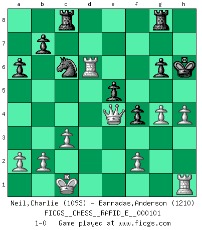 Last move : 1-0 2013 April 17 4:8:43 [Event "FICGS__CHESS__RAPID_E__000101"] [Site "FICGS"] [Date "2013.04.07"] [Round "1"] [White "Neil,Charlie"] [Black "Barradas,Anderson"] [Result "1-0"] [WhiteElo "1093"] [BlackElo "1210"] 1.e4 c5 2.Nf3 d6 3.d4 cxd4 4.Nxd4 e5 5.Nb5 a6 6.N5a3 Nf6 7.Bd3 Nc6 8.Nc3 Be6 9.Be3 Be7 10.Nc4 O-O 11.Nb6 Rb8 12.Nbd5 Bxd5 13.Nxd5 Nxd5 14.exd5 Qa5+ 15.c3 Qxd5 16.Bxh7+ Kxh7 17.Qxd5 f5 18.O-O-O f4 19.Qe4+ g6 20.Bb6 Rfe8 21.h4 Kh6 22.Bc7 Rbc8 23.Bxd6 Bxd6 24.Rxd6 Rg8 25.g4 1-0 Sicilian Kingside Castling by player Black (move 10) Queenside Castling by player White (move 18) Player White won this chess game. Follow this game move after move (download)Chess is like war on a board. (Bobby Fischer) Der Verteidiger gebe der Gewalt nach, aber nur der Gewalt. Er schaffe sich nicht freiwillig, etwa aus Blindheit oder aus Schrecken, irgendwelche Schwächen. Er lasse sich nicht bluffen. (Emanuel Lasker) El ganar no lo es todo... pero el perder es nada. (Mednis) Le plus grand jeu de l'esprit jamais inventé, plus vous l'apprenez, plus vous y prenez du plaisir. (Garry Kasparov) You can only get smarter by playing a smarter opponent. (Revolver, movie)