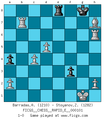 Last move : 1-0 2013 April 15 19:1:31 [Event "FICGS__CHESS__RAPID_E__000101"] [Site "FICGS"] [Date "2013.04.07"] [Round "1"] [White "Barradas,Anderson"] [Black "Stoyanov,Zdravko"] [Result "1-0"] [WhiteElo "1210"] [BlackElo "1282"] 1.e4 c5 2.Nf3 Nc6 3.d4 cxd4 4.Nxd4 Nxd4 5.Qxd4 d6 6.Nc3 e5 7.Qd5 Ne7 8.Qd3 h6 9.Be2 Nc6 10.b3 Nb4 11.Qb5+ Nc6 12.Bb2 Bd7 13.Qc4 Be6 14.Nd5 Bxd5 15.exd5 Na5 16.Qb5+ Ke7 17.b4 Qb6 18.bxa5 Qxb5 19.Bxb5 a6 20.Ba4 g6 21.O-O Bg7 22.Rfe1 Rhc8 23.f4 f6 24.g4 Rab8 25.Rac1 b5 26.axb6 Rxb6 27.Ba3 Rc3 28.Bb3 a5 29.Bb2 Rf3 30.Re4 f5 31.gxf5 gxf5 32.Rc4 Kf7 33.Rc7+ Kg6 34.Rc6 Rb7 35.Rxd6+ Kh7 36.fxe5 Re3 37.Bd4 Re4 38.c3 Bxe5 39.Bxe5 Rxe5 40.c4 f4 41.Rb1 a4 42.Bc2+ Kg8 43.Rxb7 Re8 44.Rxh6 f3 45.Bh7+ 1-0 Sicilian defense Kingside Castling by player White (move 21) Player White won this chess game. Follow this game move after move (download)The most important feature of the Chess position is the activity of the pieces. This is absolutely fundamental in all phases of the game: Opening, Middlegame and especially Endgame. The primary constraint on a piece's activity is the Pawn structure. (Michael Stean) Wie kann ich Remis annehmen? Ich weiß ja gar nicht, wie ich stehe! (Fritz Sämisch) En la perfecta combinación de Ajedrez como en una historia corta de primera clase, toda la trama y contra trama deberá conducir hacia un final sorprendente, el interes no es mitigado hasta el último momento. (Yates and Winter) D'abord les bases : Jouez et étudiez, puis étudiez et jouez, ensuite jouez et étudiez, puis étudiez et jouez. Deuxièmement : Donnez toujours le meilleur de vous-même ! (Ken Smith) Don't be irreplaceable, if you can't be replaced, you can't be promoted. (Dan Rotaru)