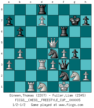 Last move : 1/2-1/2 2013 April 7 18:4:43 [Event "FICGS__CHESS__FREESTYLE_CUP__000005"] [Site "FICGS"] [Date "2013.04.07"] [Round "1"] [White "Dineen,Thomas"] [Black "Fuller,Liam"] [Result "1/2-1/2"] [WhiteElo "2207"] [BlackElo "2345"] 1.d4 Nf6 2.c4 e6 3.Nf3 b6 4.g3 Ba6 5.Qa4 c5 6.Bg2 Bb7 7.dxc5 Bxc5 8.O-O O-O 9.Nc3 Nc6 10.Bf4 Nh5 11.Bd2 Qc8 12.Rad1 f5 13.a3 Be7 14.b4 Nd8 15.Qb3 Nf7 16.Rfe1 Bf6 17.Rc1 d6 18.Be3 g5 19.Red1 f4 20.Bd2 g4 21.Ne1 Bxg2 22.Nxg2 Ng5 23.Bxf4 Nh3+ 24.Kf1 Be5 25.e3 Qb7 26.Rd3 Qf3 27.Nd1 Nf6 28.c5 Ne4 29.Qxe6+ Rf7 30.cxd6 Bxf4 31.d7 Rd8 32.Qe8+ Rf8 33.Qe6+ Rf7 34.Qe8+ Rf8 35.Qe6+ Kg7 36.gxf4 Nhxf2 37.Qe5+ Rf6 38.Qe7+ Rf7 39.Qe5+ Rf6 1/2-1/2 Queen's Indian : Nimzovich variation (exaggerated Fianchetto) Kingside Castling by player White (move 8) Kingside Castling by player Black (move 8) This chess game ended in a draw. Follow this game move after move (download)An attack on the wing should be met by play in the center. (Nimzovitch) Je mehr wir mit Computern analysieren, desto mehr glauben wir an Verteidigung. (Vladimir Kramnik) Los problemas de Ajedrez exigen del compositor las mismas virtudes que caracterizan todo el arte de valor: originalidad, invención, concisión, armonía, complejidad e insinceridad explendida. (Vladimir Nabokov) Les Echecs sont affaire de jugement sensible. Savoir quand frapper et quand esquiver. (Fischer) Inventor: A person who makes an ingenious arrangement of wheels, levers and springs, and believes it civilization. (Ambrose Bierce, The Devil's Dictionary)