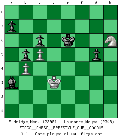 Last move : 0-1 2013 April 7 17:44:4 [Event "FICGS__CHESS__FREESTYLE_CUP__000005"] [Site "FICGS"] [Date "2013.04.07"] [Round "1"] [White "Eldridge,Mark"] [Black "Lowrance,Wayne"] [Result "0-1"] [WhiteElo "2298"] [BlackElo "2348"] 1.e4 e5 2.Nf3 Nc6 3.Bb5 Nf6 4.Nc3 Bc5 5.O-O O-O 6.Nxe5 Nxe5 7.d4 Bd6 8.f4 Nfg4 9.dxe5 Bc5+ 10.Kh1 Nxh2 11.g3 Nxf1 12.Bxf1 d6 13.exd6 Qxd6 14.Qxd6 Bxd6 15.Be3 Re8 16.Kg2 Bb4 17.Nd5 Rxe4 18.Kf3 Rxe3+ 19.Nxe3 Bd7 20.a3 Bc5 21.b4 Bc6+ 22.Kf2 Bd4 23.Rd1 Rd8 24.Rd2 Kf8 25.c3 Bf6 26.Rxd8+ Bxd8 27.Bg2 Bxg2 28.Kxg2 Ke7 29.Kf3 g6 30.Ke2 b5 31.c4 c6 32.Kd2 Ke6 33.Kd3 f5 34.Nf1 Bf6 35.c5 h6 36.Ne3 g5 37.fxg5 hxg5 38.g4 fxg4 39.Nxg4 Bb2 40.Nh6 Bxa3 0-1 Ruy Lopez : Berlin defense Kingside Castling by player White (move 5) Kingside Castling by player Black (move 5) 10 pieces endgame at move 40 : White KNPP , Black KBPPPP WHITE : King + 1 Knight 2 Pawns BLACK : King + 1 Bishop 4 Pawns Player Black won this chess game. Follow this game move after move (download)Chess, like love, like music, has the power to make people happy. (Siegbert Tarrasch) Wenn ich Weiß habe gewinne ich weil ich Weiß habe, wenn ich Schwarz habe gewinne ich weil ich Bogoljubov bin. (Efim Bogoljubov) No todos los artistas son jugadores de Ajedrez, pero todos los jugadores de Ajedrez son artistas. (Marcel Duchamp) La tactique, c'est ce que vous faites quand il y a quelque chose à faire; la stratégie, c'est ce que vous faites quand il n'y a rien à faire. (Savielli Tartacower) Chess is as much a mystery as women. (Purdy)