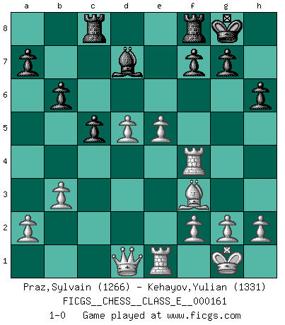 Last move : 1-0 2013 April 20 21:5:20 [Event "FICGS__CHESS__CLASS_E__000161"] [Site "FICGS"] [Date "2013.04.07"] [Round "1"] [White "Praz,Sylvain"] [Black "Kehayov,Yulian"] [Result "1-0"] [WhiteElo "1266"] [BlackElo "1331"] 1.d4 d5 2.c4 e6 3.e3 c5 4.Nf3 Nc6 5.Be2 Nf6 6.O-O Bd6 7.Nc3 e5 8.dxe5 Nxe5 9.Nxd5 Nxd5 10.cxd5 O-O 11.b3 Nxf3+ 12.Bxf3 Qg5 13.e4 Bf4 14.Bxf4 Qxf4 15.Rc1 b6 16.Re1 Bd7 17.Rc4 Rac8 18.e5 h6 19.Rxf4 1-0 Queen's gambit declined Kingside Castling by player White (move 6) Kingside Castling by player Black (move 10) Player White won this chess game. Follow this game move after move (download)Could we look into the head of a Chess player, we should see there a whole world of feelings, images, ideas, emotion and passion. (Alfred Binet) Kombinieren und Schwarzhandel gehören verboten. (Savielly Grigorievitsch Tartakower) Una victoria por una combinación errónea, aunque sea espectacular, me llena de horror artÃstico. (Wilhelm Steinitz) Si rien de grave n'est détecté lors de l'analyse d'une position, on joue alors le coup. Seconde règle de Blumenfeld. Perfection is achieved, not when there is nothing more to add, but when there is nothing left to take away. (Antoine de Saint-Exupéry)