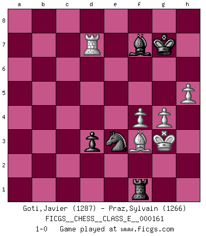 Last move : 1-0 2013 July 15 19:7:11 [Event "FICGS__CHESS__CLASS_E__000161"] [Site "FICGS"] [Date "2013.04.07"] [Round "1"] [White "Goti,Javier"] [Black "Praz,Sylvain"] [Result "1-0"] [WhiteElo "1287"] [BlackElo "1266"] 1.c4 e5 2.Nc3 f5 3.e3 Nf6 4.Nf3 e4 5.Ne5 d6 6.Nf7 Kxf7 7.Be2 g6 8.d3 exd3 9.Qxd3 Bg7 10.O-O Re8 11.f3 Nc6 12.a3 Re5 13.f4 Re7 14.Bf3 Bd7 15.b4 a5 16.b5 Na7 17.Bxb7 Rb8 18.Bf3 c6 19.a4 cxb5 20.cxb5 Rb6 21.Rb1 Bc8 22.Ba3 Be6 23.h3 Rc7 24.Rfd1 Nc8 25.Nd5 Nxd5 26.Bxd5 Qe7 27.Bc6 Bf8 28.Qc3 Bg7 29.Qd3 Bf8 30.Qc3 Qf6 31.Qxa5 Bd7 32.Bd5+ Be6 33.Bb2 Qd8 34.Bf3 Ra7 35.Qb4 d5 36.Qc3 Rxa4 37.Qh8 Rxb5 38.Qxh7+ Ke8 39.Qxg6+ Bf7 40.Qxf5 Nd6 41.Qe5+ Be7 42.h4 Nc4 43.Qh8+ Bf8 44.Bg7 Qe7 45.Qxf8+ Qxf8 46.Bxf8 Rxb1 47.Rxb1 Kxf8 48.Rb8+ Kg7 49.g4 Nxe3 50.h5 Ra1+ 51.Kf2 d4 52.Rb7 Rf1+ 53.Kg3 d3 54.Rd7 1-0 English Opening Kingside Castling by player White (move 10) Player White won this chess game. Follow this game move after move (download)White lost because he failed to remember the right continuation and had to think up the moves himself. (Siegbert Tarrasch) Es genügt nicht ein guter Spieler zu sein, man muß auch gut spielen. (Siegbert Tarrasch) El Ajedrez es parte de una cultura y si una cultura esta en decadencia, entonces también el Ajedrez declinará. (Mikhail Botvinnik) Les échecs sont un jeu terrible. Si vous n'avez pas le centre, votre adversaire a une position plus libre. Par contre, si vous avez le centre, alors vous avez vraiment quelque chose pour laquelle vous inquiéter ! (Siegbert Tarrasch) God is an atheist. (Unknown)