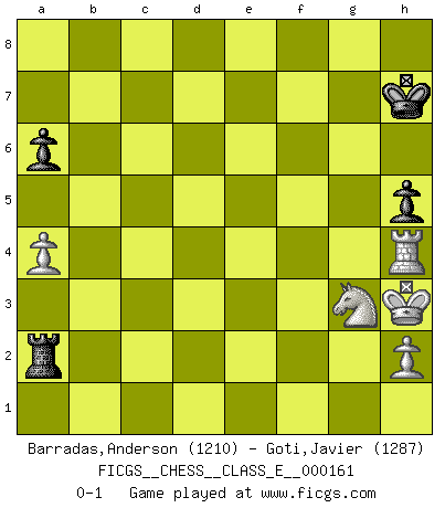 Last move : 0-1 2013 June 30 2:20:21 [Event "FICGS__CHESS__CLASS_E__000161"] [Site "FICGS"] [Date "2013.04.07"] [Round "1"] [White "Barradas,Anderson"] [Black "Goti,Javier"] [Result "0-1"] [WhiteElo "1210"] [BlackElo "1287"] 1.e4 c5 2.Nf3 Nc6 3.d4 cxd4 4.Nxd4 g6 5.Nc3 Bg7 6.Nxc6 bxc6 7.Bc4 e6 8.O-O d5 9.exd5 cxd5 10.Bb5+ Bd7 11.Bxd7+ Qxd7 12.Re1 Ne7 13.Bg5 O-O 14.Bxe7 Qxe7 15.Nxd5 Qd8 16.Nc3 a6 17.Qxd8 Rfxd8 18.Rad1 e5 19.Nd5 f5 20.g3 e4 21.Ne7+ Kh8 22.b3 Bc3 23.Rxd8+ Rxd8 24.Nc6 Rd2 25.Re3 Rxc2 26.a4 g5 27.f4 gxf4 28.gxf4 Bd2 29.Re2 Rc1+ 30.Kg2 Bxf4 31.Ne7 Rb1 32.Nxf5 Rxb3 33.Rxe4 Rb8 34.Rxf4 h5 35.Rh4 Kh7 36.Ng3 Rb2+ 37.Kh3 Ra2 0-1 Sicilian : Accelerated Fianchetto, Modern variation Kingside Castling by player White (move 8) Kingside Castling by player Black (move 13) 10 pieces endgame at move 33 : White KRNPP , Black KRBPP WHITE : King + 1 Rook 1 Knight 2 Pawns BLACK : King + 1 Rook 1 Bishop 2 Pawns 9 pieces endgame at move 34 : White KRNPP , Black KRPP WHITE : King + 1 Rook 1 Knight 2 Pawns BLACK : King + 1 Rook 2 Pawns Player Black won this chess game. Follow this game move after move (download)Help your pieces so they can help you. (Paul Morphy) Wenn du auf das Glück wartest, wird das Leben ziemlich langweilig. (Mikhail Nekhemyevich Tal) Las Aperturas te enseñan aperturas. ¡Los Finales te enseñan Ajedrez!. (Stephan Gerzadowicz) Le plus grand jeu de l'esprit jamais inventé, plus vous l'apprenez, plus vous y prenez du plaisir. (Garry Kasparov) The Movers & Shakers of this world are those who play chess in the mornings and go to the disco in the evenings. (Dinesh De Silva)