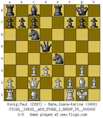 Last move : 1-0 2007 April 5 16:1:29 [Event "FICGS__CHESS__WCH_STAGE_1_GROUP_25__000002"] [Site "FICGS"] [Date "2007.01.30"] [Round "1"] [White "Konig,Paul"] [Black "Baha,Ioana-Karina"] [Result "1-0"] [WhiteElo "2287"] [BlackElo "1400"] 1.c4 e5 2.Nc3 Nf6 3.Nf3 Nc6 4.g3 Bb4 5.Bg2 O-O 6.O-O e4 7.Ng5 Bxc3 8.bxc3 Re8 9.Qc2 d5 10.cxd5 Qxd5 11.Nxe4 Nxe4 12.d3 1-0 This chess game has been lost on time (started : 2007.01.30 17:48:9) English Opening Kingside Castling by player Black (move 5) Kingside Castling by player White (move 6) Player White won this chess game. Follow this game move after move (download)The Pin is mightier than the sword. (Fred Reinfeld) Wer nie einen Fehler gemacht hat, hat nie etwas Neues ausprobiert. (Albert Einstein) Si pudieramos observar el interior de la cabeza de un jugador de Ajedrez, encontraríamos ahí un mundo lleno de sentimientos, imágenes, ideas, emoción y pasión. (Alfred Binet) Pour moi, les échecs ne sont pas un jeu mais un art. (Alexandre Alekhine) Tomorrow's what you make of it. (Horatio Caine, C.S.I. Miami)