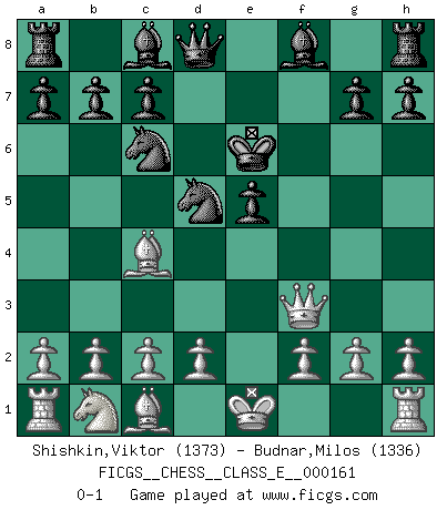 Last move : 0-1 2013 May 28 23:49:36 [Event "FICGS__CHESS__CLASS_E__000161"] [Site "FICGS"] [Date "2013.04.07"] [Round "1"] [White "Shishkin,Viktor"] [Black "Budnar,Milos"] [Result "0-1"] [WhiteElo "1373"] [BlackElo "1336"] 1.e4 e5 2.Nf3 Nc6 3.Bc4 Nf6 4.Ng5 d5 5.exd5 Nxd5 6.Nxf7 Kxf7 7.Qf3+ Ke6 0-1 This chess game has been lost on time (started : 2013.04.07 21:27:43) Two knights defense : Fegatello attack Player Black won this chess game. Follow this game move after move (download)All Chess players should have a hobby. (Savielly Tartakower) Schach verlangt totale Konzentration. (Robert James Fischer) Ayuda a tus piezas para que ellas te puedan ayudar. (Paul Morphy) Ne tendez aucun piège pour le plaisir ! Ne jouez rien dans l'espoir que l'adversaire réagisse de façon stupide ! Prenez toujours pour acquis que l'adversaire va trouver le meilleur coup ! Ne jouez jamais de coup dans l'espoir que l'adversaire ne voie pas la menace ! Chacun de vos coups doit améliorer la position d'une façon ou d'une autre. All maxims have their antagonist maxims; proverbs should be sold in pairs, a single one being but a half truth. (William Mathews)