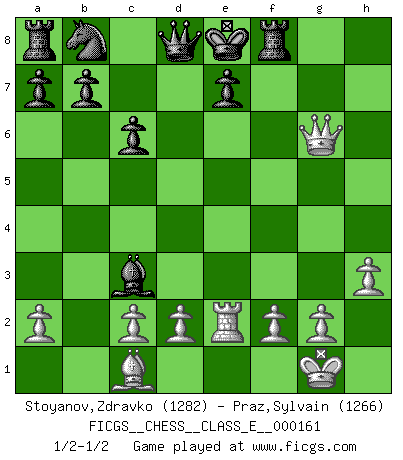 Last move : 1/2-1/2 2013 April 16 19:52:11 [Event "FICGS__CHESS__CLASS_E__000161"] [Site "FICGS"] [Date "2013.04.07"] [Round "1"] [White "Stoyanov,Zdravko"] [Black "Praz,Sylvain"] [Result "1/2-1/2"] [WhiteElo "1282"] [BlackElo "1266"] 1.e4 c6 2.Nf3 g6 3.h3 Bg7 4.e5 d6 5.Be2 dxe5 6.O-O Be6 7.Re1 e4 8.Ng5 Nf6 9.Nxe6 fxe6 10.Bg4 Nxg4 11.Qxg4 Rf8 12.Rxe4 Qb6 13.Re2 Bxb2 14.Qxe6 Bf6 15.Qc8+ Qd8 16.Qe6 Bxa1 17.Nc3 Rf6 18.Qg8+ Rf8 19.Qxh7 Bxc3 20.Qxg6+ Rf7 21.Qg8+ Rf8 22.Qg6+ Rf7 23.Qg8+ Rf8 24.Qg6+ 1/2-1/2 Caro-Kann defense Kingside Castling by player White (move 6) This chess game ended in a draw. Follow this game move after move (download)Chess is really ninety nine percent calculation. (Soltis) Gott hat gewollt, dass ich Champion werde. (Surab Azmajparaschvili) Un buen jugador siempre tiene buena suerte. (José Raúl Capablanca) Des idées, des idées, j'en ai cent, j'en ai mille. Des bonnes, des mauvaises, applicables, irréalisables... Il suffit de faire le tri ! (Roos) For to win one hundred victories in one hundred battles is not the acme of skill. To subdue the enemy without fighting is the acme of skill. (Sun Tzu)