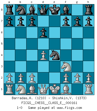 Last move : 1-0 2013 May 18 10:51:37 [Event "FICGS__CHESS__CLASS_E__000161"] [Site "FICGS"] [Date "2013.04.07"] [Round "1"] [White "Barradas,Anderson"] [Black "Shishkin,Viktor"] [Result "1-0"] [WhiteElo "1210"] [BlackElo "1373"] 1.e4 e5 2.Nf3 Nf6 3.Nxe5 d6 4.Nf3 Nxe4 5.d4 1-0 This chess game has been lost on time (started : 2013.04.07 21:27:43) Petrov : Classical attack Player White won this chess game. Follow this game move after move (download)It is difficult to play against Einstein's theory --on his first loss to Fischer. (Mikhail Tal) Die FIDE ist dabei in die Hände der russischen Mafia zu fallen. (Larry Evans) A través de las casillas del tablero, los Indios explican el movimiento del tiempo y la edad, las influencias mas altas que controlan el mundo y los lazos que vinculan al Ajedrez con el alma humana. (Al-Masudi) Ce qui caractérise les parties de combat, c'est que si le défenseur a constamment de difficiles problèmes à résoudre, l'attaquant doit chercher sans relâche de nouvelles possibilités d'attaque. (Koblentz) There's no money in correspondence chess. (John Knudsen)
