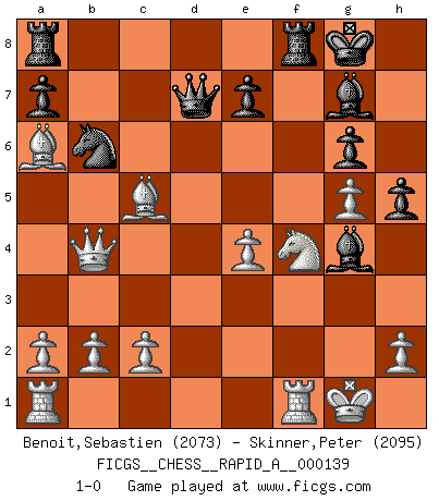 Last move : 1-0 2013 May 27 21:43:9 [Event "FICGS__CHESS__RAPID_A__000139"] [Site "FICGS"] [Date "2013.04.08"] [Round "1"] [White "Benoit,Sebastien"] [Black "Skinner,Peter"] [Result "1-0"] [WhiteElo "2073"] [BlackElo "2095"] 1.e4 d6 2.d4 Nf6 3.Nc3 g6 4.Be3 c6 5.Qd2 Bg7 6.f3 b5 7.g4 h5 8.g5 Nfd7 9.f4 Nb6 10.Nf3 O-O 11.Bd3 Bg4 12.O-O Qd7 13.f5 b4 14.Ne2 c5 15.dxc5 dxc5 16.Bxc5 Na6 17.Bxa6 Bxf3 18.Qxb4 Bg4 19.fxg6 fxg6 20.Nf4 1-0 Pirc : 150 attack Kingside Castling by player Black (move 10) Kingside Castling by player White (move 12) Player White won this chess game. Follow this game move after move (download)Winning isn't everything... but losing is nothing. (Mednis) Besser ein falscher Plan, logisch durchgeführt, als gar kein Plan. (Viktor Kortschnoi) La partida mas dura de ganar es una partida ganada. (Emanuel Lasker) Mais l'homme est une créature légère et illogique : semblable au joueur d'échecs, il n'aime que le processus du but à atteindre, non le but lui-même. (Dostoïevsky) It is not titles that honor men, but men that honor titles. (Niccolo Machiavelli)