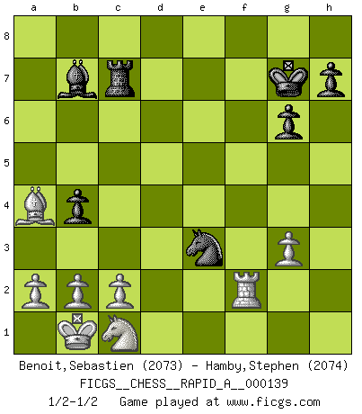 Last move : 1/2-1/2 2013 August 13 13:43:42 [Event "FICGS__CHESS__RAPID_A__000139"] [Site "FICGS"] [Date "2013.04.08"] [Round "1"] [White "Benoit,Sebastien"] [Black "Hamby,Stephen"] [Result "1/2-1/2"] [WhiteElo "2073"] [BlackElo "2074"] 1.e4 e6 2.d4 d5 3.Nc3 Nf6 4.e5 Nfd7 5.f4 c5 6.Nf3 Nc6 7.Be3 cxd4 8.Nxd4 Bc5 9.Qd2 O-O 10.O-O-O a6 11.Nb3 Bxe3 12.Qxe3 b5 13.Qh3 b4 14.Bd3 g6 15.Ne2 Qb6 16.Kb1 a5 17.Qh6 a4 18.h4 Ndxe5 19.fxe5 Nxe5 20.h5 Ng4 21.Qg5 e5 22.hxg6 fxg6 23.Nd2 Qf6 24.Qxf6 Rxf6 25.Rhf1 e4 26.Nxe4 dxe4 27.Bxe4 Rxf1 28.Rxf1 Ra7 29.Rf4 Kg7 30.Bc6 Re7 31.Nc1 Rc7 32.Bxa4 Ne3 33.Rf2 Bb7 34.g3 1/2-1/2 French : Steinitz, Boleslavsky variation Kingside Castling by player Black (move 9) Queenside Castling by player White (move 10) This chess game ended in a draw. Follow this game move after move (download)Who is your opponent tonight, tonight I am playing against the Black pieces. (Akiba Rubinstein) Jeder weiß, dass Gasprom Putins persönliches Machtinstrument ist. Die Firma wird vom Kreml aus geleitet und wird schon deshalb nie transparent sein. (Garry Kasparov) Juega la Apertura como un libro, el Juego Medio como un mago y los Finales como una máquina. (Spielmann) Le jeu d'échecs fait naître et fortifie en nous plusieurs qualités précieuses dans le cours de l'existence, telles que la prévoyance, la circonspection, la prudence, et la persévérance. (Benjamin Franklin - 1783, la morale des échecs) There is no instance of a country having benefited from prolonged warfare. (Sun Tzu)