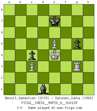 Last move : 1-0 2013 June 3 18:36:3 [Event "FICGS__CHESS__RAPID_A__000139"] [Site "FICGS"] [Date "2013.04.08"] [Round "1"] [White "Benoit,Sebastien"] [Black "Salonen,Jukka"] [Result "1-0"] [WhiteElo "2073"] [BlackElo "1965"] 1.e4 c5 2.Nf3 d6 3.d4 cxd4 4.Nxd4 Nf6 5.Nc3 Nc6 6.Bg5 e6 7.Qd2 Be7 8.O-O-O Nxd4 9.Qxd4 O-O 10.f4 h6 11.Bh4 Qa5 12.Bc4 e5 13.fxe5 dxe5 14.Qd3 Bg4 15.Rdf1 Rac8 16.Bxf6 Bxf6 17.Bb3 Rxc3 18.Qxc3 Bg5+ 19.Kb1 Qxc3 20.bxc3 g6 21.Rxf7 Rxf7 22.Rf1 Bf4 23.g3 Bh3 24.Rf3 Bg4 25.Rd3 Bg5 26.h3 Bxh3 27.Rf3 Bf4 28.gxf4 Bg2 29.Rd3 Kf8 30.Bxf7 Kxf7 31.fxe5 Bxe4 32.Rd6 h5 33.Kc1 Bc6 34.Kd2 h4 35.Rf6+ Kg7 36.Rf2 Bd7 37.Ke3 Be6 38.Rf6 h3 39.Kf3 Bxa2 40.Kg3 a5 41.Kxh3 a4 42.Rd6 Kf8 43.Kg3 Ke7 44.Rd4 b5 45.Rd6 a3 46.Ra6 Bd5 47.c4 bxc4 48.Kf4 Be6 49.Ra7+ Bd7 50.Ke4 g5 51.Rxa3 Bg4 52.Rg3 Bd1 53.c3 1-0 Sicilian : Richter-Rauzer, Rauzer attack, 7...Be7 Queenside Castling by player White (move 8) Kingside Castling by player Black (move 9) 10 pieces endgame at move 41 : White KRPPP , Black KBPPP WHITE : King + 1 Rook 3 Pawns BLACK : King + 1 Bishop 3 Pawns 9 pieces endgame at move 47 : White KRPP , Black KBPPP WHITE : King + 1 Rook 2 Pawns BLACK : King + 1 Bishop 3 Pawns 8 pieces endgame at move 51 : White KRPP , Black KBPP WHITE : King + 1 Rook 2 Pawns BLACK : King + 1 Bishop 2 Pawns Player White won this chess game. Follow this game move after move (download)The passed Pawn is a criminal, who should be kept under lock and key. Mild measures, such as police surveillance, are not sufficient. (Aaron Nimzovich) Die Idee von Capablanca, Schach als Fach in den Schulen zu lehren, ist großartig. (Fidel Castro) Yo creo que el Ajedrez posee una magia que es también una ayuda en la edad avanzada. Una rodilla reumática es olvidada durante una partida de Ajedrez y otros eventos pueden parecer algo sin importancia comparada a una catástrofe en el tablero de Ajedrez. (Vlastimil Hort) A ce moment-là, je menaçais de comprendre la position ! (Clément L'Heureux) The meaning of life is that it is to be lived, and it is not to be traded and conceptualized and squeezed into a pattern of systems. (Bruce Lee)