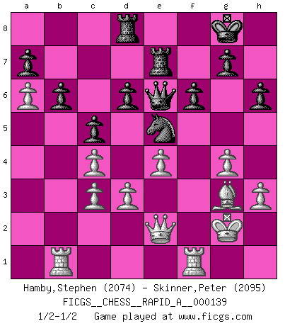 Last move : 1/2-1/2 2013 September 27 12:12:1 [Event "FICGS__CHESS__RAPID_A__000139"] [Site "FICGS"] [Date "2013.04.08"] [Round "1"] [White "Hamby,Stephen"] [Black "Skinner,Peter"] [Result "1/2-1/2"] [WhiteElo "2074"] [BlackElo "2095"] 1.c4 e5 2.g3 Nf6 3.Bg2 h6 4.Nc3 Bb4 5.Nf3 Bxc3 6.bxc3 d6 7.O-O O-O 8.Rb1 Nfd7 9.d3 Nf6 10.Ne1 c6 11.Ba3 Na6 12.Nc2 Re8 13.e4 Nc5 14.Ne3 Qa5 15.Bb4 Qc7 16.f4 exf4 17.Bxc5 fxe3 18.Bxe3 Qe7 19.Bf4 Bg4 20.Qc2 Nh7 21.h3 Be6 22.a4 Rad8 23.g4 Nf8 24.Bg3 Rd7 25.Qf2 c5 26.Rfc1 f6 27.Qe2 Bf7 28.a5 Ne6 29.Qf1 Rc8 30.Bf3 Nd8 31.Bd1 Rdc7 32.Ba4 Be6 33.Qf4 Nf7 34.Qe3 Qd8 35.Kg2 Re7 36.Ra1 Rb8 37.Qe2 Ne5 38.Bf4 Qc7 39.Bc2 Rf8 40.Rf1 Nc6 41.Qf2 Ref7 42.Qg3 Rd8 43.a6 b6 44.Ba4 Ne5 45.Qe3 Bd7 46.Bxd7 Rfxd7 47.Rab1 Re7 48.Bg3 Qc8 49.Ra1 Qd7 50.Qd2 Qc7 51.Rfb1 Qd7 52.Rc1 Qe6 53.Rf1 R7e8 54.Qe2 Rd7 55.Rab1 Rf7 56.Rf5 Rd8 57.R5f1 Re7 1/2-1/2 English Opening Kingside Castling by player White (move 7) Kingside Castling by player Black (move 7) This chess game ended in a draw. Follow this game move after move (download)There just isn't enough televised Chess. (David Letterman) Der 70jährige Viktor Kortschnoi: Die Rentenanstalt wollte mich zwingen in Rente zu gehen. Meine Frau erhält jetzt eine Pension- und ich zahle weiter in die Rentenkasse ein! (Viktor Kortschnoi) En un gambito tu regalas un Peón por el bién de tomar un juego perdido. (Samuel Standige Boden) Il n'y a pas eu de défaite parce que je ne crois pas que cet ordinateur ait jamais existé. IBM a triché en refusant d'imprimer les modes de recherche de la machine. C'est évident, pendant le match, des coups décisifs ont été joués par des êtres humains. Aujourd'hui, les meilleurs spécialistes en informatique ne peuvent toujours pas expliquer comment Deep-Blue a pu jouer contre la logique des ordinateurs. IBM a gagné une guerre de communication, mais ils sont incapables de prouver que l'ordinateur a gagné tout seul. (Garry Kasparov) At last I discovered the true beauty of chess. So I proposed to her. (Dinesh De Silva)
