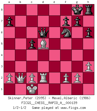 Last move : 1/2-1/2 2013 June 26 20:45:27 [Event "FICGS__CHESS__RAPID_A__000139"] [Site "FICGS"] [Date "2013.04.08"] [Round "1"] [White "Skinner,Peter"] [Black "Mevel,Alberic"] [Result "1/2-1/2"] [WhiteElo "2095"] [BlackElo "1986"] 1.Nc3 d5 2.d4 Nf6 3.Bg5 Nbd7 4.Nf3 h6 5.Bh4 e6 6.Qd3 Be7 7.O-O-O c5 8.e4 c4 9.Qe3 Nxe4 10.Bxe7 Qxe7 11.Nxe4 dxe4 12.Qxe4 Nf6 13.Qe5 c3 14.d5 cxb2+ 15.Qxb2 exd5 16.Bb5+ Kf8 17.Rhe1 Qd6 18.Re3 Bg4 19.Be2 b6 20.h3 Bxf3 21.Bxf3 Rc8 22.Rd2 Rc5 23.Rc3 Kg8 24.Rxc5 bxc5 25.Bxd5 1/2-1/2 Dunst (Sleipner, Heinrichsen) Opening Queenside Castling by player White (move 7) This chess game ended in a draw. Follow this game move after move (download)Fischer is under obligation to nobody. (Joseph Platz) Je älter ich werde, um so mehr schätze ich die Bauern. (Paul Keres) Botvinnik trataba de restarle el misterio al Ajedrez, siempre relacionandolo a situaciones de la vida ordinaria. El gustaba de llamar al Ajedrez un típico problema inexacto similar a aquellos de los cuales la gente siempre tiene que enfrentarse en la vida cotidiana. (Garry Kasparov) Mon pion favori sur ma case favorite ! Bronstein en parlant d'un coup de pion en h5 quand il avait les Noirs. Everybody lies. (Gregory House, House M.D.)