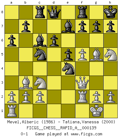 Last move : 0-1 2013 June 10 23:49:47 [Event "FICGS__CHESS__RAPID_A__000139"] [Site "FICGS"] [Date "2013.04.08"] [Round "1"] [White "Mevel,Alberic"] [Black "Tatiana,Vanessa"] [Result "0-1"] [WhiteElo "1986"] [BlackElo "2000"] 1.e4 c5 2.Nf3 d6 3.d4 cxd4 4.Nxd4 Nf6 5.Nc3 a6 6.Bc4 e6 7.Bb3 Nbd7 8.f4 Nc5 9.f5 Be7 10.O-O Bd7 11.Bg5 Rc8 12.Qf3 e5 13.Nde2 Bc6 14.Ng3 O-O 15.Rf2 Kh8 16.Nh5 Nfxe4 0-1 Sicilian : Najdorf, Lipnitzky attack Kingside Castling by player White (move 10) Kingside Castling by player Black (move 14) Player Black won this chess game. Follow this game move after move (download)One doesn't have to play well, it's enough to play better than your opponent. (Siegbert Tarrasch) Nie in meinem Leben habe ich die französische Verteidigung gespielt, welche die Stumpfsinnigste von allen ist. (Wilhelm Steinitz) Evita las multitudes. Haz independientemente tu propio razonamiento. Trata de ser el jugador de Ajedrez, no la pieza de Ajedrez. (Ralph Charell) Ne tendez aucun piège pour le plaisir ! Ne jouez rien dans l'espoir que l'adversaire réagisse de façon stupide ! Prenez toujours pour acquis que l'adversaire va trouver le meilleur coup ! Ne jouez jamais de coup dans l'espoir que l'adversaire ne voie pas la menace ! Chacun de vos coups doit améliorer la position d'une façon ou d'une autre. Sometimes it pays to stay in bed in Monday, rather than spending the rest of the week debugging Monday's code. (Dan Salomon)