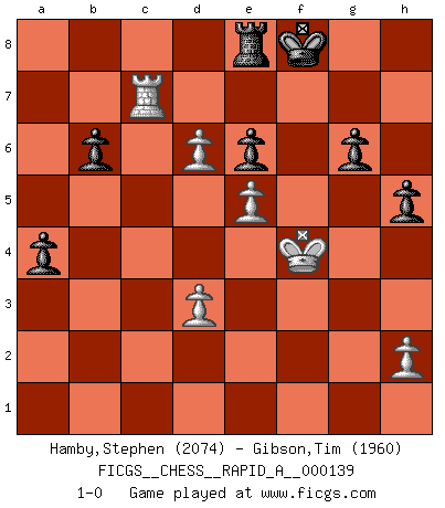 Last move : 1-0 2013 August 25 4:45:47 [Event "FICGS__CHESS__RAPID_A__000139"] [Site "FICGS"] [Date "2013.04.08"] [Round "1"] [White "Hamby,Stephen"] [Black "Gibson,Tim"] [Result "1-0"] [WhiteElo "2074"] [BlackElo "1960"] 1.Nf3 Nf6 2.c4 c5 3.g3 Nc6 4.Bg2 e5 5.Nc3 Be7 6.O-O O-O 7.d3 d6 8.a3 h6 9.Rb1 Be6 10.b4 Qd7 11.bxc5 dxc5 12.e4 Rfe8 13.Nd5 Bd8 14.Nd2 b6 15.f4 exf4 16.gxf4 Bg4 17.Nf3 Nd4 18.Bb2 Rc8 19.Bxd4 Nxd5 20.cxd5 cxd4 21.Qd2 Qa4 22.Qb4 Bd7 23.Nxd4 Be7 24.Qxa4 Bxa4 25.Kf2 Rc3 26.Ke3 Bc5 27.Rbc1 Rxa3 28.Ra1 Rxa1 29.Rxa1 Bb3 30.d6 a5 31.e5 Be6 32.Rc1 Kf8 33.Ke4 Bc8 34.Kd5 h5 35.f5 Bxd4 36.Kxd4 Bxf5 37.Rf1 g6 38.Be4 Bh3 39.Rf2 Kg7 40.Bd5 Bf5 41.Rc2 Be6 42.Bxe6 fxe6 43.Ke4 a4 44.Rc7+ Kf8 45.Kf4 1-0 Reti Opening Kingside Castling by player White (move 6) Kingside Castling by player Black (move 6) Player White won this chess game. Follow this game move after move (download)We cannot resist the fascination of sacrifice, since a passion for sacrifices is part of a Chessplayer's nature. (Rudolf Spielman) Je mehr ich von der FIDE weiss, um so weniger verstehe ich. (Alexander Kalifman) Juega la Apertura como un libro, el Juego Medio como un mago y los Finales como una máquina. (Spielmann) Toute estimation doit être constamment réévaluée. (Jacob Estrin) The age of a woman doesn't mean a thing. The best tunes are played on the oldest fiddles. (Ralph Waldo Emerson)
