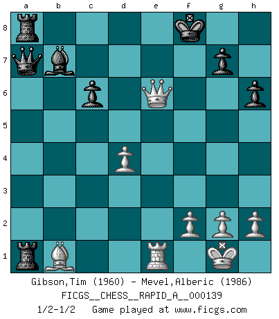 Last move : 1/2-1/2 2013 July 14 10:3:5 [Event "FICGS__CHESS__RAPID_A__000139"] [Site "FICGS"] [Date "2013.04.08"] [Round "1"] [White "Gibson,Tim"] [Black "Mevel,Alberic"] [Result "1/2-1/2"] [WhiteElo "1960"] [BlackElo "1986"] 1.d4 d5 2.c4 e6 3.Nf3 Nf6 4.Nc3 c6 5.e3 Nbd7 6.Qc2 Bd6 7.Bd3 dxc4 8.Bxc4 b5 9.Bd3 Bb7 10.a3 a6 11.b4 a5 12.bxa5 Rxa5 13.O-O O-O 14.Ng5 h6 15.Nce4 Be7 16.Nxf6+ Nxf6 17.Nh7 Nxh7 18.Bxh7+ Kh8 19.Be4 Qb6 20.Bb2 Rfa8 21.Qc3 Qa7 22.Bb1 b4 23.Qc2 f5 24.e4 bxa3 25.exf5 exf5 26.Bxa3 Bxa3 27.Rxa3 Rxa3 28.Qxf5 Kg8 29.Qh7+ Kf8 30.Qf5+ Kg8 31.Qe6+ Kf8 32.Re1 Ra1 33.Qe7+ Kg8 34.Qe6+ Kf8 35.Qe7+ Kg8 36.Qe6+ Kf8 1/2-1/2 Queen's gambit declined Kingside Castling by player White (move 13) Kingside Castling by player Black (move 13) This chess game ended in a draw. Follow this game move after move (download)In Chess, as it is played by masters, chance is practically eliminated. (Emanuel Lasker) Er war ein guter Schachspieler, aber ich kann Leute nicht ausstehen, die 'Heil Hitler' rufen (Über Alexander Aljechin). (Miguel Najdorf) Haz el enroque temprano y seguido. (Rob Sillars) Votre prénom est 'Tactique', votre deuxième prénom est 'Tactique' et votre nom est 'Tactique'. (Ken Smith) You can think I'm wrong, but that's no reason to quit thinking. (Gregory House, House M.D.)