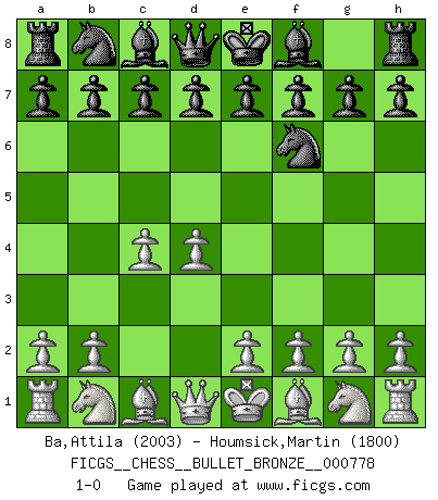 Last move : 1-0 2013 April 8 18:15:24 [Event "FICGS__CHESS__BULLET_BRONZE__000778"] [Site "FICGS"] [Date "2013.04.08"] [Round "1"] [White "Ba,Attila"] [Black "Houmsick,Martin"] [Result "1-0"] [WhiteElo "2003"] [BlackElo "1800"] 1.d4 Nf6 2.c4 1-0 This chess game has been lost on time (started : 2013.04.08 17:59:55) Queen's pawn game Player White won this chess game. Follow this game move after move (download)When you don't know what to do, wait for your opponent to get an idea - it's sure to be wrong. (Tarrasch) Auf jeden Fall musst du zuerst Rechtsanwalt werden, damit du deine eigenen Interessen und die deiner Familie vertreten kannst. [Brief an seinen Sohn] (José Raúl Capablanca) La última cosa en que Fischer estaba interesado era en tonterías, siempre y cuando el Ajedrez estuviera involucrado. (Elie Agur) Si rien de grave n'est détecté lors de l'analyse d'une position, on joue alors le coup. Seconde règle de Blumenfeld. Now be brave and don't look back. Don't look back. (Shmi Skywalker in Star Wars ep.1)