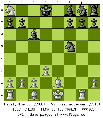 Last move : 0-1 2013 July 11 15:10:54 [Event "FICGS__CHESS__THEMATIC_TOURNAMENT__000162"] [Site "FICGS"] [Date "2013.04.09"] [Round "1"] [White "Mevel,Alberic"] [Black "Van Assche,Jeroen"] [Result "0-1"] [WhiteElo "1986"] [BlackElo "2519"] 1.e4 e5 2.f4 exf4 3.Nc3 Qh4+ 4.Ke2 d5 5.Nxd5 Bg4+ 6.Nf3 Nc6 7.Nxc7+ Kd8 8.Nxa8 Ne5 9.Qe1 Nxf3 10.Qxh4+ Nxh4 11.Ke1 f3 12.gxf3 Bxf3 13.Rg1 Bxe4 14.Be2 Nf5 15.d3 Bc6 0-1 This chess game has been lost on time (started : 2013.04.09 12:4:20) KGA : Keres (Mason-Steinitz) gambit Player Black won this chess game. Follow this game move after move (download)Man is a frivolous, a specious creature, and like a Chess player, cares more for the process of attaining his goal than for the goal itself. (Dostoyevsky) Modernes Schach sorgt sich zuviel um Dinge wie Bauernstruktur usw. Vergessen Sie das, Schachmatt beendet das Spiel! (Nigel Short) Tu eres para mi la Reina en d8 y yo soy el Peón en d7!!. (GM Eduard Gufeld) Il vaut mieux sacrifier les pièces de l'adversaire. (Xavier Tartacover) I live to kill Traxler counterattack. (Ilmars Cirulis)