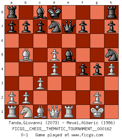 Last move : 0-1 2013 August 25 17:19:29 [Event "FICGS__CHESS__THEMATIC_TOURNAMENT__000162"] [Site "FICGS"] [Date "2013.04.09"] [Round "1"] [White "Tanda,Giovanni"] [Black "Mevel,Alberic"] [Result "0-1"] [WhiteElo "2073"] [BlackElo "1986"] 1.e4 e5 2.f4 exf4 3.Nf3 g5 4.h4 g4 5.Ne5 Nf6 6.Bc4 d5 7.exd5 Bd6 8.O-O Bxe5 9.Re1 Qe7 10.c3 Nh5 11.d4 Nd7 12.Bb5 Kd8 0-1 KGA : Kieseritsky, Berlin defense, 6.Bc4 Kingside Castling by player White (move 8) Player Black won this chess game. Follow this game move after move (download)My opponents make good moves too. Sometimes I don't take these things into consideration. (Bobby Fischer) Konzentriere dich auf materielle Gewinne. Nimm, was dir dein Gegner gibt, ausser es gibt einen guten Grund der dagegenspricht. (Robert James Fischer) En posiciones complicadas, Bobby Fischer pocas veces tuvo que temer de cualquiera. (Paul Keres) L'attaque fait le spectacle, la défense gagne les matchs. (Dicton footballistique) I've lost money so fast in these clubs it's left me reeling. I've read every poker book ever written, but the only way to get better at the game is to go out and play with people who are really good. The problem is, you stand to lose a lot of money doing it. (Matt Damon)