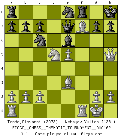 Last move : 0-1 2013 July 25 13:36:10 [Event "FICGS__CHESS__THEMATIC_TOURNAMENT__000162"] [Site "FICGS"] [Date "2013.04.09"] [Round "1"] [White "Tanda,Giovanni"] [Black "Kehayov,Yulian"] [Result "0-1"] [WhiteElo "2073"] [BlackElo "1331"] 1.e4 e5 2.f4 exf4 3.Nf3 d5 4.exd5 Qxd5 5.Nc3 Qd8 6.Bc4 Nf6 7.O-O Bc5+ 8.d4 Be7 9.Bxf4 O-O 10.Ne5 Bd6 11.Qf3 Bxe5 12.dxe5 Ne8 13.Be3 Nc6 14.Bxf7+ Kh8 15.Qh5 Qe7 16.Nd5 Be6 0-1 This chess game has been lost on time (started : 2013.04.09 12:4:20) KGA : Abbazia defense (Classical defense, Modern defense!) Kingside Castling by player White (move 7) Kingside Castling by player Black (move 9) Player Black won this chess game. Follow this game move after move (download)It began to feel as though you were playing against Chess itself. - On playing against Robert Fischer. (Walter Shipman) Capablanka war das größte Genie der Schachgeschichte! Aber denken sie nicht er habe nichts vom Schach verstanden. Er wusste nur soviel wie er wissen musste um seine Ziele zu erreichen. (Mikhail Moiseyevich Botvinik) ¿Cual es el objetivo de jugar una apertura de gambito?... Para adquirir una reputación de ser un jugador apuesto a costo de perder el juego. (Siegbert Tarrasch) Le système Elo représente seulement une moyenne. Il est simplement un indicateur de votre stabilité. (Anatoli Karpov) The weakness of an artist is dogma. (Josh Waitzkin)