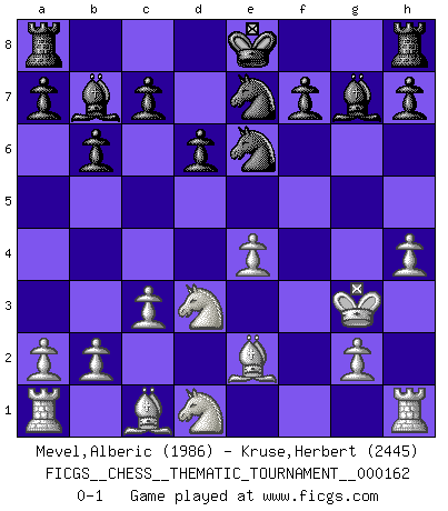 Last move : 0-1 2013 July 3 10:15:39 [Event "FICGS__CHESS__THEMATIC_TOURNAMENT__000162"] [Site "FICGS"] [Date "2013.04.09"] [Round "1"] [White "Mevel,Alberic"] [Black "Kruse,Herbert"] [Result "0-1"] [WhiteElo "1986"] [BlackElo "2445"] 1.e4 e5 2.f4 exf4 3.Nc3 Qh4+ 4.Ke2 g5 5.Nf3 Qh5 6.d4 d6 7.Kf2 Ne7 8.h4 g4 9.Ng1 Bg7 10.Nge2 Nbc6 11.Nxf4 g3+ 12.Kxg3 Qxd1 13.Nxd1 Nxd4 14.c3 Ne6 15.Nd3 b6 16.Be2 Bb7 0-1 This chess game has been lost on time (started : 2013.04.09 12:4:20) KGA : Keres (Mason-Steinitz) gambit Player Black won this chess game. Follow this game move after move (download)Many have become Chess Masters, no one has become the Master of Chess. (Siegbert Tarrasch) Wie kann ich Remis annehmen? Ich weiß ja gar nicht, wie ich stehe! (Fritz Sämisch) Sin errores no puede haber brillantez. (Emanuel Lasker) Le temps de noter son nom sur la feuille de partie, j'étais déjà en zeitnot ! D'un modeste amateur apparié lors de la première ronde d'un open contre le grand-maître Azmaïparashvili. In God we trust, all others we virus scan. (Anonymous)