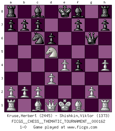 Last move : 1-0 2013 May 19 23:3:26 [Event "FICGS__CHESS__THEMATIC_TOURNAMENT__000162"] [Site "FICGS"] [Date "2013.04.09"] [Round "1"] [White "Kruse,Herbert"] [Black "Shishkin,Viktor"] [Result "1-0"] [WhiteElo "2445"] [BlackElo "1373"] 1.e4 e5 2.f4 exf4 3.Nf3 g5 4.h4 g4 5.Ne5 d6 6.Nxg4 Nf6 7.Nxf6+ Qxf6 8.Nc3 Nc6 9.Nd5 Qg6 10.d3 1-0 This chess game has been lost on time (started : 2013.04.09 12:4:20) KGA : Kieseritsky, Kolisch defense Player White won this chess game. Follow this game move after move (download)Even the laziest King flees wildly in the face of a double check ! (Aaron Nimzowitsch) Im Hotelzimmer gab es nur zwei Schaben. (Über die Turnierbedingungen) (Peter Swidler) Cuando la partida de Ajedrez termina, el Peón y el Rey regresan a la misma caja. (Irish saying) Les Echecs ne sont pas pour les âmes timides. Ils requièrent un homme entier, qui ne s'arrête pas aveuglément à ce qui a été déjà établi, mais qui tente individuellement de sonder les profondeurs du jeu. (W. Steinitz) You can only get smarter by playing a smarter opponent. (Revolver, movie)