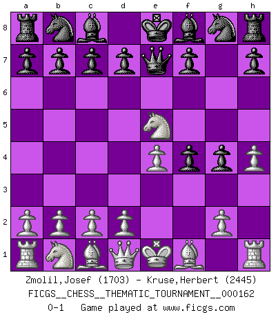 Last move : 0-1 2013 May 19 23:3:26 [Event "FICGS__CHESS__THEMATIC_TOURNAMENT__000162"] [Site "FICGS"] [Date "2013.04.09"] [Round "1"] [White "Zmolil,Josef"] [Black "Kruse,Herbert"] [Result "0-1"] [WhiteElo "1703"] [BlackElo "2445"] 1.e4 e5 2.f4 exf4 3.Nf3 g5 4.h4 g4 5.Ne5 Qe7 0-1 This chess game has been lost on time (started : 2013.04.09 12:4:20) KGA : Kieseritsky, Salvio (Rosenthal) defense Player Black won this chess game. Follow this game move after move (download)As one by one I mowed them down, my superiority soon became apparent. (Jose Capablanca) Frage des Reporters: -Worin besteht das Ziel von Gambiteröffnungen? Antwort: -Auf Kosten der Partie einen Ruf als Angriffspieler zu erwerben.- (Siegbert Tarrasch) La captura del Rey enemigo es la finalidad pero no el primer objetivo de la partida. (William Steinitz) Votre prénom est 'Tactique', votre deuxième prénom est 'Tactique' et votre nom est 'Tactique'. (Ken Smith) That's absurd. I love it. (Gregory House, House M.D.)