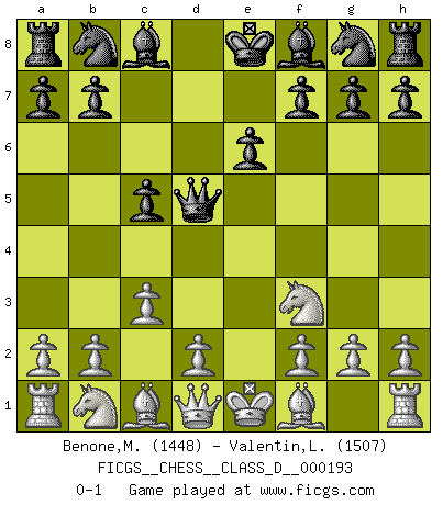 Last move : 0-1 2013 June 21 13:20:48 [Event "FICGS__CHESS__CLASS_D__000193"] [Site "FICGS"] [Date "2013.04.12"] [Round "1"] [White "Benone,Mateia"] [Black "Valentin,Laurentiu"] [Result "0-1"] [WhiteElo "1448"] [BlackElo "1507"] 1.e4 c5 2.c3 e6 3.Nf3 d5 4.exd5 Qxd5 0-1 This chess game has been lost on time (started : 2013.04.12 14:32:15) Sicilian : Alapin's variation (2.c3) Player Black won this chess game. Follow this game move after move (download)Chess demands total concentration. (Bobby Fischer) Im Schach gewinnt jeder. Hat man Freunde am Spiel - und das ist die Hauptsache - ist auch der Verlust einer Partie kein Unglück. (David Bronstein) Aún deseo matar a Fischer. (Boris Spassky) Karpov est une pièce de musée. (Garry Kasparov) Life is pleasant. Death is peaceful. It's the transition that's troublesome. (Isaac Asimov)
