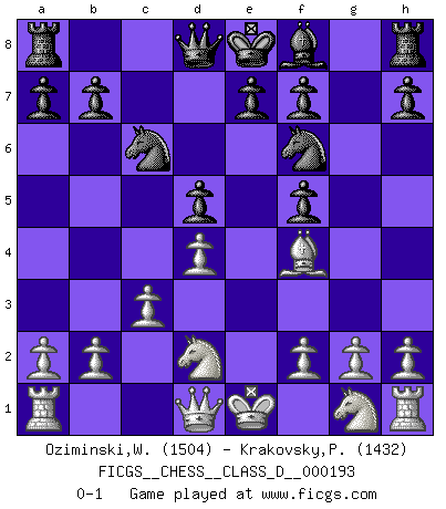 Last move : 0-1 2013 May 27 8:7:23 [Event "FICGS__CHESS__CLASS_D__000193"] [Site "FICGS"] [Date "2013.04.12"] [Round "1"] [White "Oziminski,Wojciech"] [Black "Krakovsky,Peter"] [Result "0-1"] [WhiteElo "1504"] [BlackElo "1432"] 1.e4 c6 2.d4 d5 3.exd5 cxd5 4.Bd3 Nc6 5.c3 Nf6 6.Bf4 g6 7.Nd2 Bf5 8.Bxf5 gxf5 0-1 Caro-Kann : Exchange, Rubinstein variation Player Black won this chess game. Follow this game move after move (download)Spassky will not be psyched out by Fischer. (Mike Goodall) Ein Springer auf f6 gegen die eigene Rochadestellung ist schlimmer als ein rostiger Nagel im Knie. (Efim Bogoljubov) El juego de Fischer siempre fue nítido, racional y brillante. Uno de los mejores por siempre. (Dave Regis) Nous sommes les pions de la mystérieuse partie d'Echecs jouée par Dieu. Il nous déplace, nous arrête, nous pousse encore, puis nous lance un à un dans la boîte du Néant. Epitaphe sur la tombe de David Janowsky (1868-1927). Methinks King Thibault should dub Marius Zubac a knight of the square board... I mean table, henceforth addressing him as Sir Marius, and bestow on him a suitable land from the kingdom of FICGS & marry him off to a worthy, fair maiden, lest he slice our heads with his mighty sword in his wrath. (Dinesh De Silva)