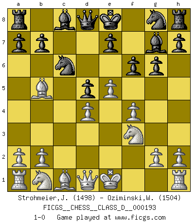Last move : 1-0 2013 May 27 8:7:14 [Event "FICGS__CHESS__CLASS_D__000193"] [Site "FICGS"] [Date "2013.04.12"] [Round "1"] [White "Strohmeier,Josef"] [Black "Oziminski,Wojciech"] [Result "1-0"] [WhiteElo "1498"] [BlackElo "1504"] 1.e4 c5 2.d4 cxd4 3.c3 g6 4.cxd4 d5 5.e5 Bg7 6.Bb5+ Nc6 7.f4 f6 8.Nf3 1-0 Sicilian : Smith-Morra gambit Player White won this chess game. Follow this game move after move (download)Good positions don't win games, good moves do. (Gerald Abrahams) Schach ist mein Leben, meine Leidenschaft, was ich gelernt habe und seit meinem 14. Lebensjahr profimässig praktiziere. Darauf zu verzichten, würde mir sehr schwer fallen. (Viktor Kortschnoi) Cuando le juegas a Fischer, no es una cuestion de si vas a ganar o perder. Es una cuestion de si vas a sobrevivir. (Boris Spassky) En blitz, le Cavalier l'emporte sur le Fou. (Vlastimil Hort) Pushing plastic is for the many, pushing virtual pieces is for the fewer, pushing wood is for the very few. (Normajean Yates)