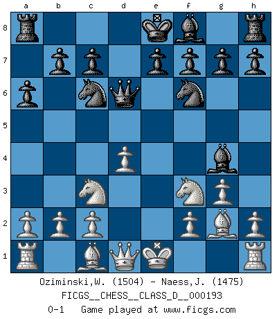 Last move : 0-1 2013 May 27 8:7:28 [Event "FICGS__CHESS__CLASS_D__000193"] [Site "FICGS"] [Date "2013.04.12"] [Round "1"] [White "Oziminski,Wojciech"] [Black "Naess,Jan-Olav"] [Result "0-1"] [WhiteElo "1504"] [BlackElo "1475"] 1.e4 d5 2.exd5 Qxd5 3.Nc3 Qd6 4.g3 Nf6 5.Bg2 a6 6.d4 Bg4 7.Nf3 Nc6 0-1 Scandinavian : Pytel-Wade variation Player Black won this chess game. Follow this game move after move (download)In Chess, at least, the brave inherit the earth. (Edmar Mednis) Fischer machte Schach einfach zu einer aufregenden Sache, wann immer er sich ans Brett setzte. (Raymond Keene) Uno no tiene que jugar muy bien, es suficiente jugar mejor que el oponente. (Siegbert Tarrasch) Je ne suis pas le dernier à jouer lâchement des coups douteux pendant le zeïtnot de l'adversaire pour l'achever: en effet les coups qui font le plus peur sont ceux que l'on ne comprend pas. Je me fais souvent peur quand je joue. (Un professeur anonyme) I don't believe in psychology. I believe in good moves. (Bobby Fischer)