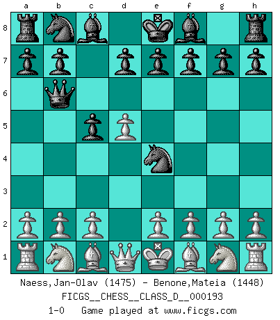 Last move : 1-0 2013 June 7 12:24:25 [Event "FICGS__CHESS__CLASS_D__000193"] [Site "FICGS"] [Date "2013.04.12"] [Round "1"] [White "Naess,Jan-Olav"] [Black "Benone,Mateia"] [Result "1-0"] [WhiteElo "1475"] [BlackElo "1448"] 1.d4 Nf6 2.Bg5 c5 3.d5 Ne4 4.Bf4 Qb6 5.Bc1 1-0 This chess game has been lost on time (started : 2013.04.12 14:32:15) Trompowsky attack (Ruth, Opovcensky Opening) Player White won this chess game. Follow this game move after move (download)Chess is a matter of delicate judgment, knowing when to punch and how to duck. (Bobby Fischer) Es war undenkbar für die Behörden, dass ein sowjetischer Großmeister auf diese Art und Weise [Fischer-Taimanov 6:0] verliert, ohne dass es eine politischer Erklärung dafür gäbe. (Mark Taimanov) Realmente no sabemos como el juego fue inventado, aunque hay sospechas. Tan pronto como descubramos a los culpables, se los haremos saber. (Bruce Pandolfini) Avec des compensations pour le matériel en plus... (Anonyme) I'll be back. (Arnold Schwarzenegger)