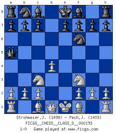 Last move : 1-0 2013 May 26 12:15:16 [Event "FICGS__CHESS__CLASS_D__000193"] [Site "FICGS"] [Date "2013.04.12"] [Round "1"] [White "Strohmeier,Josef"] [Black "Pech,Jaroslav senior"] [Result "1-0"] [WhiteElo "1498"] [BlackElo "1403"] 1.e4 d5 2.exd5 Qxd5 3.Nc3 Qa5 4.d4 Nf6 5.Nf3 1-0 Scandinavian (centre counter) defense Player White won this chess game. Follow this game move after move (download)Everything is in a state of flux, and this includes the world of Chess. (Mikhail Botvinnik) Die starken Figuren des Gegners muss man abtauschen. (José Raúl Capablanca) ¿Esta Bobby Fischer algo cuerdo?. (Salo Flohr) Tout change constamment, y compris dans le monde des Echecs. (Botvinnik) Strategy without tactics is the slowest route to victory. Tactics without strategy is the noise before defeat. (Sun Tzu)