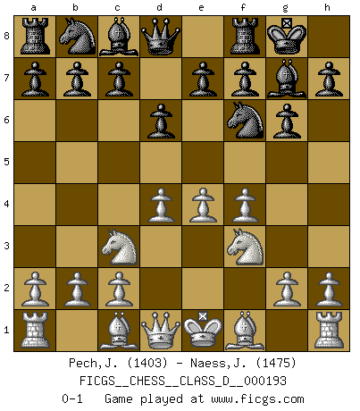 Last move : 0-1 2013 May 26 12:15:24 [Event "FICGS__CHESS__CLASS_D__000193"] [Site "FICGS"] [Date "2013.04.12"] [Round "1"] [White "Pech,Jaroslav senior"] [Black "Naess,Jan-Olav"] [Result "0-1"] [WhiteElo "1403"] [BlackElo "1475"] 1.d4 d6 2.e4 Nf6 3.Nc3 g6 4.f4 Bg7 5.Nf3 O-O 0-1 Queen's Pawn Kingside Castling by player Black (move 5) Player Black won this chess game. Follow this game move after move (download)Chess is no whit inferior to the violin, and we have a large number of professional violinists. (Mikhail Botvinnik) Wenn ich gewinne bin ich ein Genie. Wenn nicht, dann bin ich keines. (Robert James Fischer) ¿Porque tengo que perder ante este idiota?. (Aron Nimzovich) On peut tirer plus d'utilité d'une partie perdue que de 100 parties gagnées. (Capablanca) The real danger is not that computers will begin to think like men, but that men will begin to think like computers. (Sydney J. Harris)