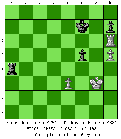 Last move : 0-1 2013 December 12 9:21:1 [Event "FICGS__CHESS__CLASS_D__000193"] [Site "FICGS"] [Date "2013.04.12"] [Round "1"] [White "Naess,Jan-Olav"] [Black "Krakovsky,Peter"] [Result "0-1"] [WhiteElo "1475"] [BlackElo "1432"] 1.d4 d5 2.Nf3 Nf6 3.Bg5 Ne4 4.Bf4 c5 5.c3 cxd4 6.cxd4 Nc6 7.Nc3 f6 8.Rc1 g5 9.Bd2 g4 10.Nxe4 dxe4 11.Nh4 Qxd4 12.e3 Qxb2 13.Bc4 Qa3 14.Bc3 Bh6 15.O-O Rf8 16.Rc2 Bg5 17.g3 Bxh4 18.gxh4 Bd7 19.Qb1 Rc8 20.Rd1 Rc7 21.Qb5 e5 22.Qd5 Qe7 23.Qxe4 f5 24.Qd5 a6 25.Bb3 Bc8 26.Ba4 Be6 27.Qd6 Kf7 28.Bxe5 Rfc8 29.Qxe7+ Rxe7 30.Bf4 Rd7 31.Rxd7+ Bxd7 32.h3 gxh3 33.Rd2 Be6 34.Kh2 b5 35.Bd1 Rd8 36.Bh5+ Kg7 37.Rb2 Rd3 38.a4 b4 39.Be2 Rb3 40.Rd2 Rc3 41.Rd6 Kf7 42.Bg5 Ne5 43.Bh5+ Ng6 44.Rxa6 b3 45.Rb6 Rc2 46.Kxh3 Rxf2 47.Kg3 Ra2 48.Bd1 Ra1 49.Rb7+ Kg8 50.Bxb3 Bxb3 51.Rxb3 Rxa4 52.Rb6 Kg7 53.Bf6+ Kf7 54.h5 Ne7 55.Bxe7 Kxe7 56.Rh6 Kf7 0-1 This chess game has been lost on time (started : 2013.04.12 14:32:15) Torre attack (Tartakower variation) Kingside Castling by player White (move 15) 10 pieces endgame at move 51 : White KRBPP , Black KRNPP WHITE : King + 1 Rook 1 Bishop 2 Pawns BLACK : King + 1 Rook 1 Knight 2 Pawns 9 pieces endgame at move 55 : White KRBPP , Black KRPP WHITE : King + 1 Rook 1 Bishop 2 Pawns BLACK : King + 1 Rook 2 Pawns 8 pieces endgame at move 55 : White KRPP , Black KRPP WHITE : King + 1 Rook 2 Pawns BLACK : King + 1 Rook 2 Pawns Player Black won this chess game. Follow this game move after move (download)In complicated positions, Bobby Fischer hardly had to be afraid of anybody. (Paul Keres) Es ist wirklich schade, dass so viele Schachspieler nicht auf ihr Äußeres achten! (Alexandra Kosteniuk) Si un gobernante no entiende al Ajedrez, ¿como puede governar él un reinado?. (El Rey Khusros II) Des points faibles ou des trous dans la position de l'adversaire doivent être occupés par des pièces et non pas par des pions. (Siegbert Tarrasch) Memory... is the diary that we all carry with us. (Oscar Wilde, The Importance of Being Earnest)