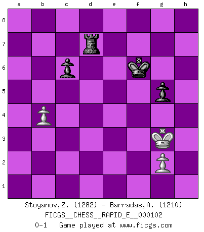 Last move : 0-1 2013 April 19 18:14:44 [Event "FICGS__CHESS__RAPID_E__000102"] [Site "FICGS"] [Date "2013.04.13"] [Round "1"] [White "Stoyanov,Zdravko"] [Black "Barradas,Anderson"] [Result "0-1"] [WhiteElo "1282"] [BlackElo "1210"] 1.e4 e5 2.Nf3 Nf6 3.d3 d6 4.h3 Nc6 5.a3 a6 6.Be2 Be7 7.O-O O-O 8.Nc3 Be6 9.Ng5 Nd4 10.Re1 h6 11.Nxe6 Nxe6 12.Be3 c6 13.d4 Ng5 14.Bxg5 hxg5 15.d5 Qb6 16.dxc6 bxc6 17.b4 a5 18.Na4 Qb7 19.c3 Nxe4 20.Bd3 Nf6 21.Qc2 axb4 22.cxb4 Nd5 23.Bc4 Nb6 24.Nxb6 Qxb6 25.Qf5 Bf6 26.Re3 d5 27.Bb3 d4 28.Bc2 g6 29.Qxf6 dxe3 30.fxe3 Qxe3+ 31.Kh1 Rxa3 32.Rd1 Qe2 33.Bxg6 Qxd1+ 34.Kh2 Qd7 35.Bf5 Qd8 36.Qh6 Rxh3+ 37.Bxh3 f5 38.Qe6+ Kg7 39.Qxe5+ Rf6 40.Bxf5 Qd6 41.Qxd6 Rxd6 42.Bg4 Kf6 43.Kg3 Rd4 44.Bd7 Rxd7 0-1 Petrov's defense Kingside Castling by player White (move 7) Kingside Castling by player Black (move 7) 10 pieces endgame at move 40 : White KQBPP , Black KQRPP WHITE : King + 1 Queen 1 Bishop 2 Pawns BLACK : King + 1 Queen 1 Rook 2 Pawns 9 pieces endgame at move 41 : White KQBPP , Black KRPP WHITE : King + 1 Queen 1 Bishop 2 Pawns BLACK : King + 1 Rook 2 Pawns 8 pieces endgame at move 41 : White KBPP , Black KRPP WHITE : King + 1 Bishop 2 Pawns BLACK : King + 1 Rook 2 Pawns 7 pieces endgame at move 44 : White KPP , Black KRPP WHITE : King + 2 Pawns BLACK : King + 1 Rook 2 Pawns Player Black won this chess game. Follow this game move after move (download)The Chess pieces are the block alphabet which shapes thoughts; and these thoughts, although making a visual design on the chessboard, express their beauty abstractly, like a poem. (Marcel Duchamp) Privat ist Kortschnoi kein schlechter Mensch, sehr sympathisch. Aber während des Spiels ist er grausam. Er will dich töten. (Miguel Najdorf) Si tu oponente no puede hacer nada activo, entonces no apures la posición; En vez de eso, dejalo estar sentado ahí, sufriendo y rogandote por un empate. (Jeremy Silman) Karpov est une pièce de musée. (Garry Kasparov) You can only get smarter by playing a smarter opponent. (Revolver, movie)