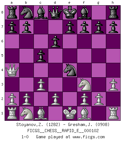 Last move : 1-0 2013 April 14 19:19:38 [Event "FICGS__CHESS__RAPID_E__000102"] [Site "FICGS"] [Date "2013.04.13"] [Round "1"] [White "Stoyanov,Zdravko"] [Black "Gresham,Jonathan"] [Result "1-0"] [WhiteElo "1282"] [BlackElo "0908"] 1.e4 c5 2.Nf3 d6 3.h3 Nf6 4.c3 Nxe4 5.Qa4+ 1-0 Sicilian Player White won this chess game. Follow this game move after move (download)My God, Bobby Fischer plays so simply. (Alexei Suetin) Ich habe kein Problem mit Frauen, sondern nur mit dem Niveau ihres Schachspiels (Judith Polgar) El Ajedrez es una guerra en un tablero. El objetivo es aplastar la mente del oponente. (Bobby Fischer) Donnez-moi un Cavalier en 6e et je gagnerais toutes mes parties. (Steinitz) The faster the computer, the slower the brain. (Thibault de Vassal)