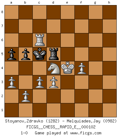 Last move : 1-0 2013 May 2 7:57:20 [Event "FICGS__CHESS__RAPID_E__000102"] [Site "FICGS"] [Date "2013.04.13"] [Round "1"] [White "Stoyanov,Zdravko"] [Black "Melquiades,Jay"] [Result "1-0"] [WhiteElo "1282"] [BlackElo "0982"] 1.e4 e5 2.Nf3 d6 3.h3 a6 4.a3 Nc6 5.d3 h6 6.Be2 Nd4 7.Nxd4 exd4 8.O-O Nf6 9.Re1 Bxh3 10.gxh3 g5 11.Nd2 g4 12.Bxg4 h5 13.Bf5 Rg8+ 14.Kh2 Ng4+ 15.hxg4 Qh4+ 16.Kg2 d5 17.exd5 Kd8 18.Rh1 Qg5 19.Nf3 Qxf5 20.Nxd4 Qe5 21.Be3 hxg4 22.Qd2 Qxd5+ 23.Kg1 g3 24.f4 g2 25.Rh2 Be7 26.Rxg2 Rxg2+ 27.Qxg2 Qxg2+ 28.Kxg2 Kd7 29.Rh1 Rg8+ 30.Kf3 c5 31.Nf5 Bf6 32.c3 b5 33.Bxc5 a5 34.Rh7 Ke6 35.Ke4 Re8 36.Nd6 Rd8 37.Nxf7 Rd5 38.Bd4 Bxd4 39.Ng5+ Kd6 40.Rh6+ Kc5 41.Ne6+ Kd6 42.Nxd4 Kc5 43.Rc6+ 1-0 Philidor's defense Kingside Castling by player White (move 8) Player White won this chess game. Follow this game move after move (download)There's never before been a Chess player with such a thorough knowledge of the intricacies of the game and such an absolutely indomitable will to win. I think Bobby is the greatest player that ever lived. (Lisa Lane) Das ganze Leben mit einer Ehefrau ist wie ein Endspiel mit ungleichfarbigen Läufern. (Viktor Kortschnoi) Todo se encuentra en un estado de flujo y esto incluye al mundo del Ajedrez. (Mikhail Botvinnik) Un footballeur joue avec ses pieds, parfois avec sa tête. Un joueur d'échecs ne joue qu'avec sa tête. Et quand il ne joue plus, il meurt. (Jacob Murray) A bird doesn't sing because it has an answer, it sings because it has a song. (Maya Angelou)