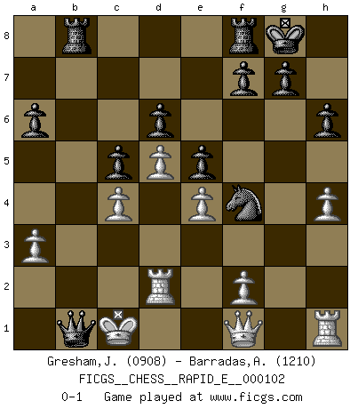Last move : 0-1 2013 April 30 22:45:49 [Event "FICGS__CHESS__RAPID_E__000102"] [Site "FICGS"] [Date "2013.04.13"] [Round "1"] [White "Gresham,Jonathan"] [Black "Barradas,Anderson"] [Result "0-1"] [WhiteElo "0908"] [BlackElo "1210"] 1.d4 Nf6 2.c4 e6 3.Nc3 Bb4 4.Nf3 d6 5.Qc2 O-O 6.e4 Nc6 7.Bg5 e5 8.d5 Nd4 9.Qd3 h6 10.Bd2 a6 11.O-O-O c5 12.h4 Nh5 13.Be2 Bg4 14.a3 Nb3+ 15.Kc2 Nxd2 16.Nxd2 Bxe2 17.Nxe2 Ba5 18.Nf3 Qd7 19.Nc1 Nf4 20.Qe3 Nxg2 21.Qe2 b5 22.b3 Nf4 23.Qf1 bxc4 24.bxc4 Qa4+ 25.Nb3 Rab8 26.Nfd2 Bxd2 27.Rxd2 Qxb3+ 28.Kc1 Qb1+ 0-1 Nimzo-Indian : Three knights variation Kingside Castling by player Black (move 5) Queenside Castling by player White (move 11) Player Black won this chess game. Follow this game move after move (download)Chess is like life. (Boris Spassky) Es tut gut, die Entwicklungsperiode von, [...] demokratischem Geist durchdringen zu lassen. Wie undemokratisch wäre es doch beispielsweise, den einen Offizier große Spaziertouren vornehmen zu lassen, während die anderen zu Hause säßen und sich entsetzlich langweilten. (Aaron Nimzowitsch) Las combinaciones han sido siempre el aspecto más intrigante del Ajedrez. Los Maestros las buscan, el público las aplauden, los críticos las alaban. La razón se debe a que las combinaciones hacen posible que el Ajedrez sea más que un ejercicio matemático con una carencia de vida. Ellas son la poesía del juego, son del Ajedrez lo que la melodía es de la música. Ellas representan el triunfo de la mente sobre la materia. (Reuben Fine) Nous sommes les pions de la mystérieuse partie d'Echecs jouée par Dieu. Il nous déplace, nous arrête, nous pousse encore, puis nous lance un à un dans la boîte du Néant. Epitaphe sur la tombe de David Janowsky (1868-1927). Methinks King Thibault should dub Marius Zubac a knight of the square board... I mean table, henceforth addressing him as Sir Marius, and bestow on him a suitable land from the kingdom of FICGS & marry him off to a worthy, fair maiden, lest he slice our heads with his mighty sword in his wrath. (Dinesh De Silva)