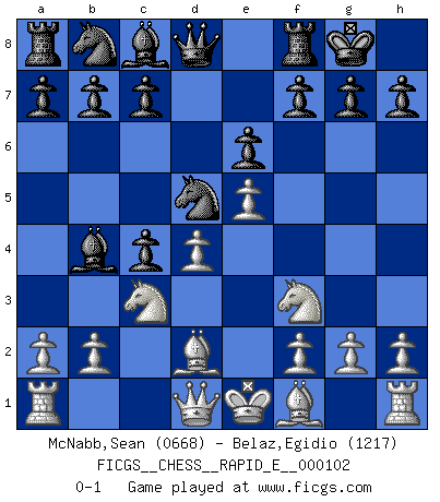 Last move : 0-1 2013 May 23 11:14:40 [Event "FICGS__CHESS__RAPID_E__000102"] [Site "FICGS"] [Date "2013.04.13"] [Round "1"] [White "McNabb,Sean"] [Black "Belaz,Egidio"] [Result "0-1"] [WhiteElo "0668"] [BlackElo "1217"] 1.d4 d5 2.c4 Nf6 3.Nc3 e6 4.Nf3 dxc4 5.e4 Bb4 6.e5 Nd5 7.Bd2 O-O 0-1 This chess game has been lost on time (started : 2013.04.13 8:26:18) QGD : Marshall defense Kingside Castling by player Black (move 7) Player Black won this chess game. Follow this game move after move (download)Fischer is under obligation to nobody. (Joseph Platz) Ein bischen Romantik kann weder im Schach noch in der Liebe schaden. Also versuche ich mich ab und zu daran zu erinnern. (Nigel Short) No es una movida, aún la mejor movida que tu debas buscar, sino un plan comprensible. (Eugene Znosko-Borovsky) Shah mat. Le roi est mort. Cri de fierté d'un joueur venant de terrasser son adversaire, courtoisement, sans effusion de sang. The Internet isn't free. It just has an economy that makes no sense to capitalism. (Brad Shapcott)