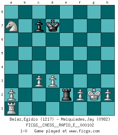 Last move : 1-0 2013 May 21 22:12:54 [Event "FICGS__CHESS__RAPID_E__000102"] [Site "FICGS"] [Date "2013.04.13"] [Round "1"] [White "Belaz,Egidio"] [Black "Melquiades,Jay"] [Result "1-0"] [WhiteElo "1217"] [BlackElo "0982"] 1.e4 e5 2.Nf3 Nc6 3.Bc4 d5 4.Bxd5 f6 5.O-O h5 6.Nh4 Nge7 7.Bc4 g5 8.Nf3 g4 9.Nh4 Nd4 10.c3 b5 11.Bd3 Ne6 12.Bxb5+ Bd7 13.Bc4 Nf4 14.d3 Nh3+ 15.Kh1 f5 16.Bg5 Bh6 17.Bf6 Rf8 18.Bxe5 Nc6 19.Nxf5 Ng5 20.Bg7 Bxg7 21.Nxg7+ Ke7 22.Nxh5 Ne5 23.Bb3 Qe8 24.Ng7 Qg6 25.Nf5+ Bxf5 26.exf5 Rxf5 27.Re1 Ngf3 28.gxf3 Kd8 29.Bd5 Nxf3 30.Bxf3 gxf3 31.Rg1 Rg5 32.Rxg5 Qxg5 33.Qxf3 Qc1+ 34.Kg2 Rb8 35.Qf8+ Kd7 36.Qf7+ Kc6 37.Qe6+ Kb7 38.Qb3+ Kc8 39.Qg8+ Kb7 40.Qc4 Qxb2 41.Qb4+ Kc8 42.Qxb2 Rxb2 43.Na3 Re2 44.Nb5 Kd7 45.Nxa7 1-0 King's pawn game Kingside Castling by player White (move 5) Player White won this chess game. Follow this game move after move (download)Chess is a part of culture and if a culture is declining then Chess too will decline. (Mikhail Botvinnik) Ihnen, Herr Lasker, habe ich nur drei Worte zu sagen: Schach und matt. (Siegbert Tarrasch) El Ajedrez es un regaderazo frío para la mente. (Sir John Simon) Tous ces prétendus hommes politiques sont les pions, les Cavaliers, les Tours ou les Fous d'une partie d'échecs qui se jouera tant qu'un hasard ne renversera pas l'échiquier. (Honoré de Balzac) He who defends everything defends nothing. (Frederick the Great)