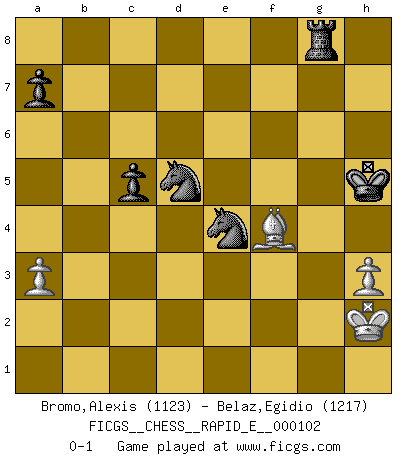 Last move : 0-1 2013 May 16 20:30:59 [Event "FICGS__CHESS__RAPID_E__000102"] [Site "FICGS"] [Date "2013.04.13"] [Round "1"] [White "Bromo,Alexis"] [Black "Belaz,Egidio"] [Result "0-1"] [WhiteElo "1123"] [BlackElo "1217"] 1.d4 d5 2.c4 Nf6 3.Nc3 e6 4.Nf3 dxc4 5.e3 Bb4 6.Bxc4 Ne4 7.Bd2 Nd6 8.a3 Bxc3 9.Bxc3 b6 10.Bb3 O-O 11.d5 exd5 12.Bxd5 c6 13.Bb3 Bg4 14.h3 Bh5 15.Qd4 Nf5 16.Qxd8 Rxd8 17.O-O Na6 18.Ne5 Nh6 19.g4 Bg6 20.Nxg6 hxg6 21.f4 Kh8 22.g5 Nf5 23.Bxf7 Kh7 24.e4 Ng3 25.Rfe1 Rf8 26.Bxg6+ Kxg6 27.f5+ Kxg5 28.Bxg7 Rg8 29.Be5 Kh4 30.Kh2 Rae8 31.Bf6+ Kh5 32.Rg1 Nc5 33.Rad1 Ncxe4 34.Bd4 Rd8 35.b4 c5 36.bxc5 bxc5 37.Be5 Rxd1 38.Rxd1 Nxf5 39.Rd5 Ne3 40.Bf4 Nxd5 0-1 QGD : Marshall defense Kingside Castling by player Black (move 10) Kingside Castling by player White (move 17) 10 pieces endgame at move 40 : White KBPP , Black KRNNPP WHITE : King + 1 Bishop 2 Pawns BLACK : King + 1 Rook 2 Knights 2 Pawns Player Black won this chess game. Follow this game move after move (download)Chess teaches you to control the initial excitement you feel when you see something that looks good and it trains you to think objectively when you're in trouble. (Stanley Kubrick) Wenn Capablanka heute auf der Schachbühne erscheinen würde, hätte er ein halbes Jahr gebraucht um sich die Schachtheorie anzueignen. Und dann hätte er alles und jeden besiegt. (Mikhail Moiseyevich Botvinik) El jugador táctico debe saber que hacer cuando algo se debe de hacer. El estratégico debe saber que hacer cuando nada se debe de hacer. (Savielly Tartakover) Une platitude souvent récitée à propos des Echecs est qu'une des choses les plus difficiles à réaliser est de gagner une position gagnante. Cela ne manque pas de sens mais, pour ma part, j'ai toujours trouvé plus difficile de gagner une position perdante. (Tim Krabbe) If you work for a living, why do you kill yourself working ? (Tuco to a chicken in The Good, The Bad and The Ugly)