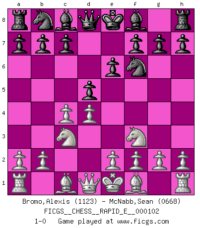 Last move : 1-0 2013 May 18 10:51:37 [Event "FICGS__CHESS__RAPID_E__000102"] [Site "FICGS"] [Date "2013.04.13"] [Round "1"] [White "Bromo,Alexis"] [Black "McNabb,Sean"] [Result "1-0"] [WhiteElo "1123"] [BlackElo "0668"] 1.d4 d5 2.c4 e6 3.Nc3 Nf6 4.Nf3 1-0 This chess game has been lost on time (started : 2013.04.13 8:26:18) QGD : 4.Nf3 Player White won this chess game. Follow this game move after move (download)A bad plan is better than none at all. (Frank Marshall) Dein Körper muss in Topform sein. Dein Schach verfällt, wenn dein Körper verfällt. Der Körper kann nicht vom Geist getrennt werden. (Robert James Fischer) Tu no necesitas jugar muy bien, únicamente ayudar a tu oponenet a que juegue muy mal. (Genrikh Chepukaitis) Un journaliste : 'Vous préférez avoir une dame de plus sur l'échiquier ou au lit ?' Boris Spassky : 'Ca dépend de la position.' . 'gn is not allowed in chess unless n is an integer between 1 and 8 inclusive, where 1 and 8 are to interpreted as the standard numerals standing for integers in the ordered real-closed field R, with the *canonical* ordering. (As opposed to, say, an integer in the domain Z[2+i*sqrt(5)] or an integer in some exotic Grothendieck topos). (Normajean Yates)