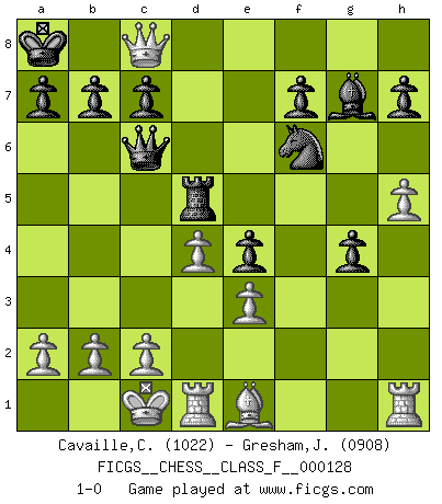 Last move : 1-0 2013 April 16 16:33:54 [Event "FICGS__CHESS__CLASS_F__000128"] [Site "FICGS"] [Date "2013.04.13"] [Round "1"] [White "Cavaille,Cedric"] [Black "Gresham,Jonathan"] [Result "1-0"] [WhiteElo "1022"] [BlackElo "0908"] 1.d4 d5 2.Nc3 Nf6 3.Nf3 Nc6 4.e3 Bg4 5.Bb5 Qd7 6.h3 Bh5 7.Qe2 O-O-O 8.Bd2 Kb8 9.O-O-O g5 10.Bxc6 Qxc6 11.g4 Bg6 12.Nxg5 Bh6 13.f4 Rhe8 14.h4 e6 15.Qf3 Ka8 16.f5 exf5 17.h5 fxg4 18.Qf4 Be4 19.Ncxe4 Rxe4 20.Qf5 Bg7 21.Nxe4 dxe4 22.Be1 Rd5 23.Qc8+ 1-0 Queen's pawn : Chigorin variation Queenside Castling by player Black (move 7) Queenside Castling by player White (move 9) Player White won this chess game. Follow this game move after move (download)Do you realize Fischer almost never has any bad pieces? He exchanges them, and the bad pieces remain with his opponents. (Yuri Balashov) Ich habe die besten Aussichten, den ersten Preis zu gewinnen - denn jeder muss gegen Steinitz spielen, nur ich nicht! (Wilhelm Steinitz) Yo tuve un dolor de muelas en la primer partida. En el segundo juego, tuve un dolor de cabeza. En el tercero, tuve un ataque de reumatísmo. En la cuarta partida, no me sentía muy bien. ¿Y en el quinto juego? Bueno, ¿que acaso uno tiene que ganar todos los juegos?. (Siegbert Tarrasch) Même un GMI sait rarement calculer sur plus de cinq coups une attaque à sacrifices. (Rudolf Spielmann) The worth of a book is to be measured by what you can carry away from it. (James Bryce)