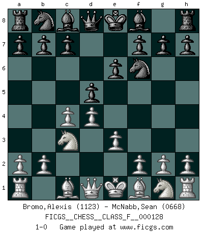 Last move : 1-0 2013 May 26 11:41:50 [Event "FICGS__CHESS__CLASS_F__000128"] [Site "FICGS"] [Date "2013.04.13"] [Round "1"] [White "Bromo,Alexis"] [Black "McNabb,Sean"] [Result "1-0"] [WhiteElo "1123"] [BlackElo "0668"] 1.d4 d5 2.c4 e6 3.Nc3 Nf6 4.e3 1-0 This chess game has been lost on time (started : 2013.04.13 14:27:36) QGD : 3...Nf6 Player White won this chess game. Follow this game move after move (download)Daring ideas are like Chess men moved forward. They may be beaten, but they may start a winning game. (Johann Wolfgang von Goethe) Schach sollte überall auf der Welt Schulfach werden. Es fördert die geistige Auseinandersetzung. Es lehrt die Demut in der Niederlage. (Garry Kasparov) El Ajedrez es parte de la cultura, y si una cultura esta en decadencia, entonces también el Ajedrez declinará. (Mikhail Botvinnik) Soyez une menace à chaque fois que vous vous asseyez pour jouer. (Ken Smith) As a goal marker shodan is important. As a destination it is a poor place to stop. (Thomas Tamayo)