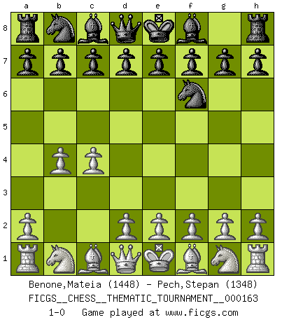 Last move : 1-0 2013 May 26 12:20:53 [Event "FICGS__CHESS__THEMATIC_TOURNAMENT__000163"] [Site "FICGS"] [Date "2013.04.14"] [Round "1"] [White "Benone,Mateia"] [Black "Pech,Stepan"] [Result "1-0"] [WhiteElo "1448"] [BlackElo "1348"] 1.b4 Nf6 2.c4 1-0 Polish (Sokolsky) opening Player White won this chess game. Follow this game move after move (download)Examine moves that smite! A good eye for smites is far more important than a knowledge of strategical principles. (Purdy) Ich bin es gewohnt, das die Jugend mir überhaupt keinen Respekt entgegenbringt. (Alexander Morozewich) El tablero es el mundo, las piezas es el fenomeno del universo, las reglas del juego son lo que llamamos leyes de la naturaleza y el jugador del lado opuesto, se encuentra oculto a nuestra vista. (Thomas Huxley) Les échecs, c'est l'art d'analyser. (Mikhail Botvinnik) Life is painting a picture, not doing a sum. (Oliver Wendell Holmes, Jr.)
